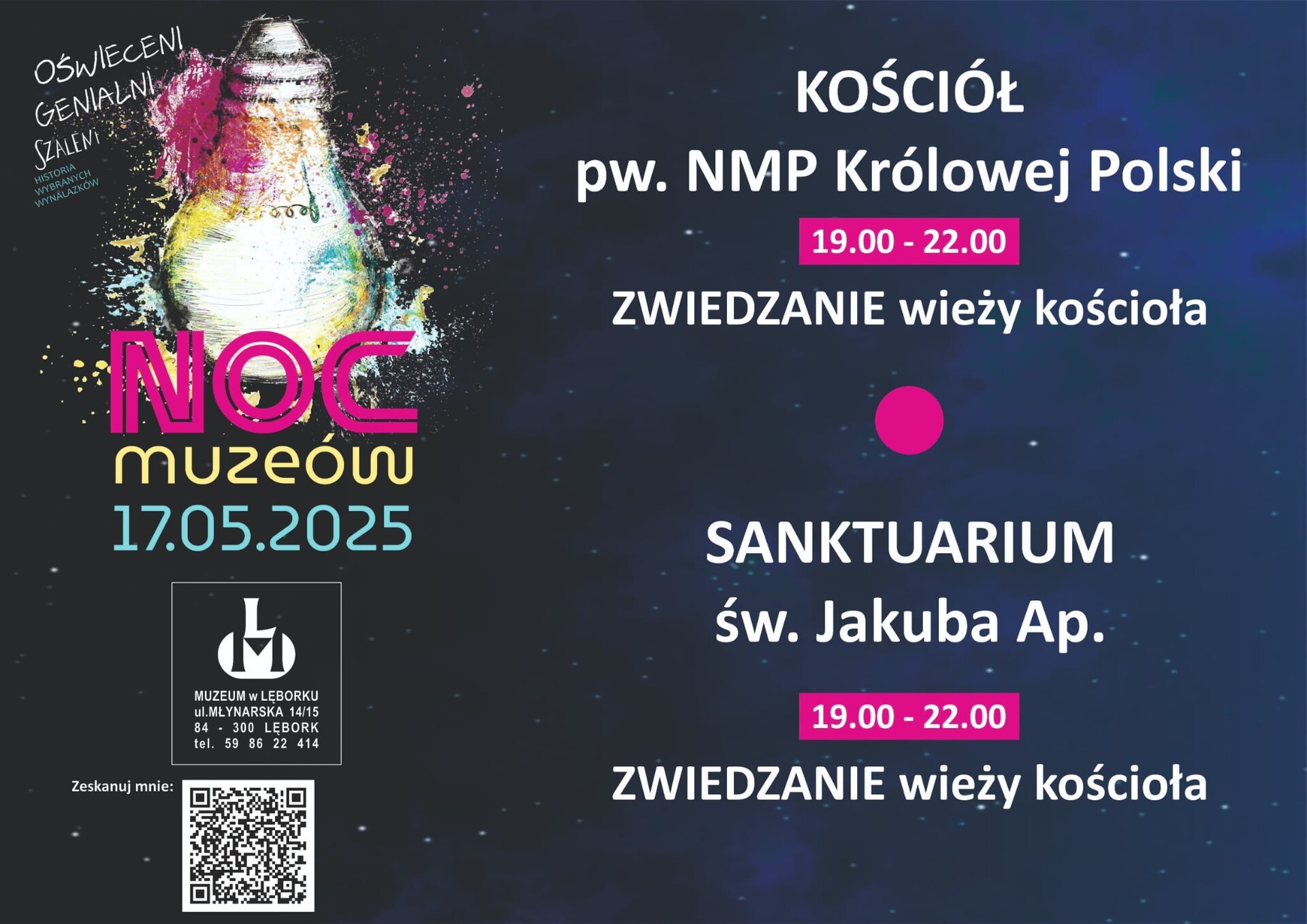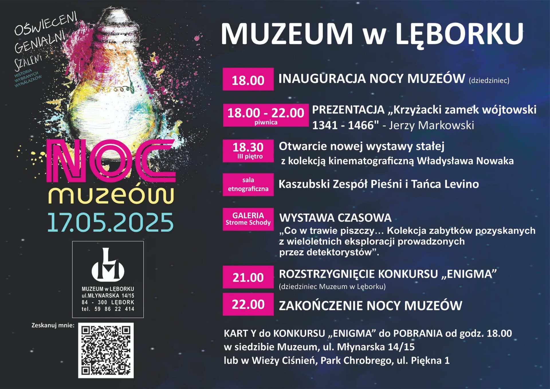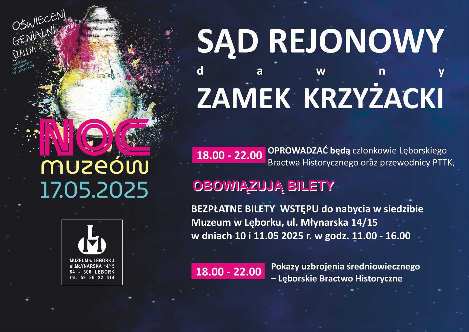 Gdy miasto zasypia… budzi się historia! To już dziś jedyna, wyjątkowa i niepowtarzalna Noc Muzeów, podczas której otwierają się dla Was drzwi muzeum, zamku, biblioteki, wież i kościołów. Będą atrakcje dla dzieci, młodzieży i dorosłych – wystawy, pokazy, zwiedzanie, warsztaty i wiele niespodzianek. Zapraszamy na magiczną noc z historią – tylko dziś, tylko w Lęborku!