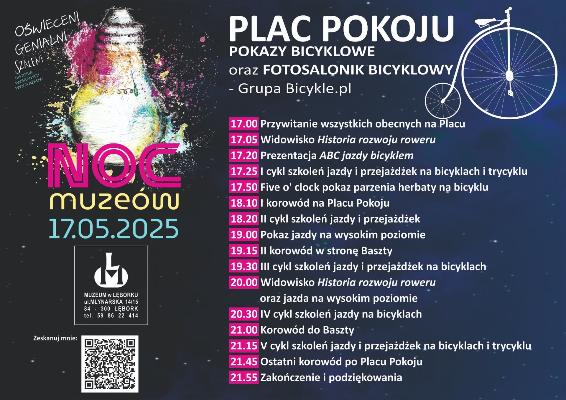 W tegorocznym programie pod hasłem „Oświeceni, genialni, szaleni. Historia wybranych wynalazków” jest wiele ciekawych atrakcji dla dzieci, młodzieży i dorosłych. „Będzie trochę światełka rozumu, szczypta szaleństwa i cała masa genialnych eksponatów – od tych, co zmieniły świat, po te, przy których pomyślicie kto to w ogóle wymyślił?! Niech Was nie zmyli tytuł – to nie wieczór noblistów, tylko podróż przez idee, które rozświetlały (i czasem podpalały) świat!” – zachęcają organizatorzy. Początek o godz. 18 na dziedzińcu Muzeum. Wstęp wolny.