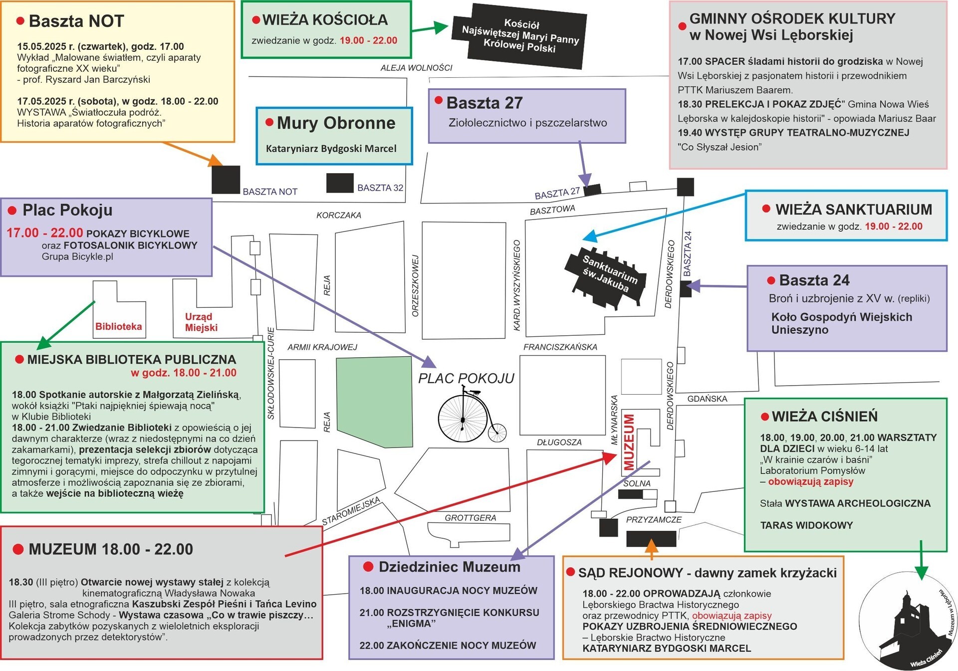 W baszcie nr 24 będzie można zobaczyć repliki broni i uzbrojenia z XV w., w baszcie nr 27 poznać ciekawostki o ziołolecznictwie i pszczelarstwie a w baszcie NOT obejrzeć wystawę o historii aparatów fotograficznych (wykład o aparatach fotograficznych odbył się 15 maja 2025 r.).