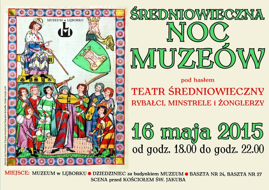 Muzeum w Lęborku zaprasza 16 maja br. o 17.30 do udziału w barwnym korowodzie, który przejdzie ulica Staromiejską, a następnie - w godzinach 18.00 do 22.00 - do Muzeum oraz baszt. Obchody Nocy Muzeów w Lęborku odbędą się pod hasłem: „Teatr średniowieczny. Rybałci, minstrele i żonglerzy”. Na scenie koło Kościoła Św. Jakuba Apostoła zaplanowano występy artystyczne, nawiązujące do tematyki średniowiecznego teatru w wykonaniu uczniów lęborskich szkół, MDK i Powiatowego Ogniska Artystycznego. Jak co roku odbędą się ciekawe konkursy dla najmłodszych i dla starszych.