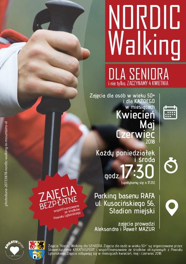 Zajęcia “Nordic Walking dla SENIORA. Zajęcia dla osób w wieku 50+” są organizowane przez Stowarzyszenie KREATIVSPORT i współfinansowane ze środków otrzymanych z Powiatu Lęborskiego na rok 2018 .