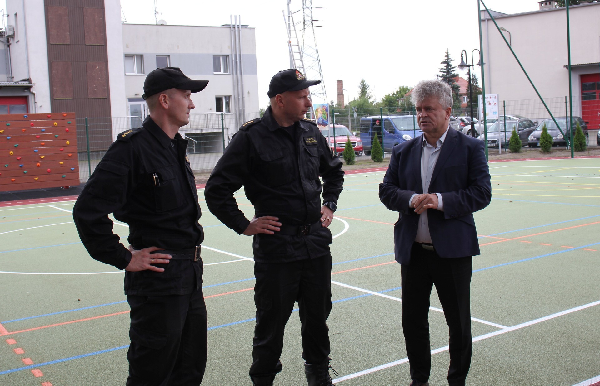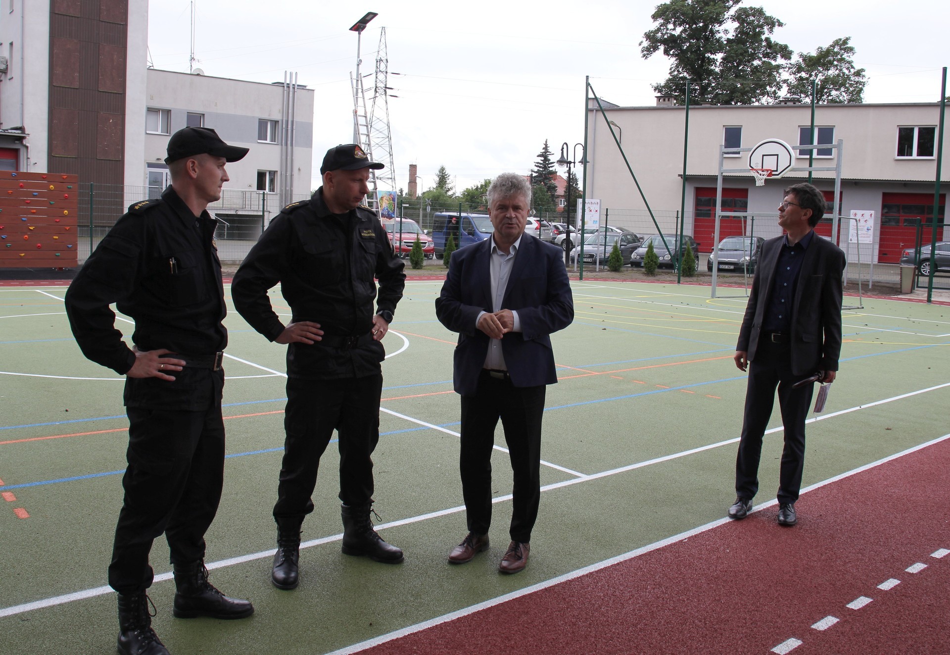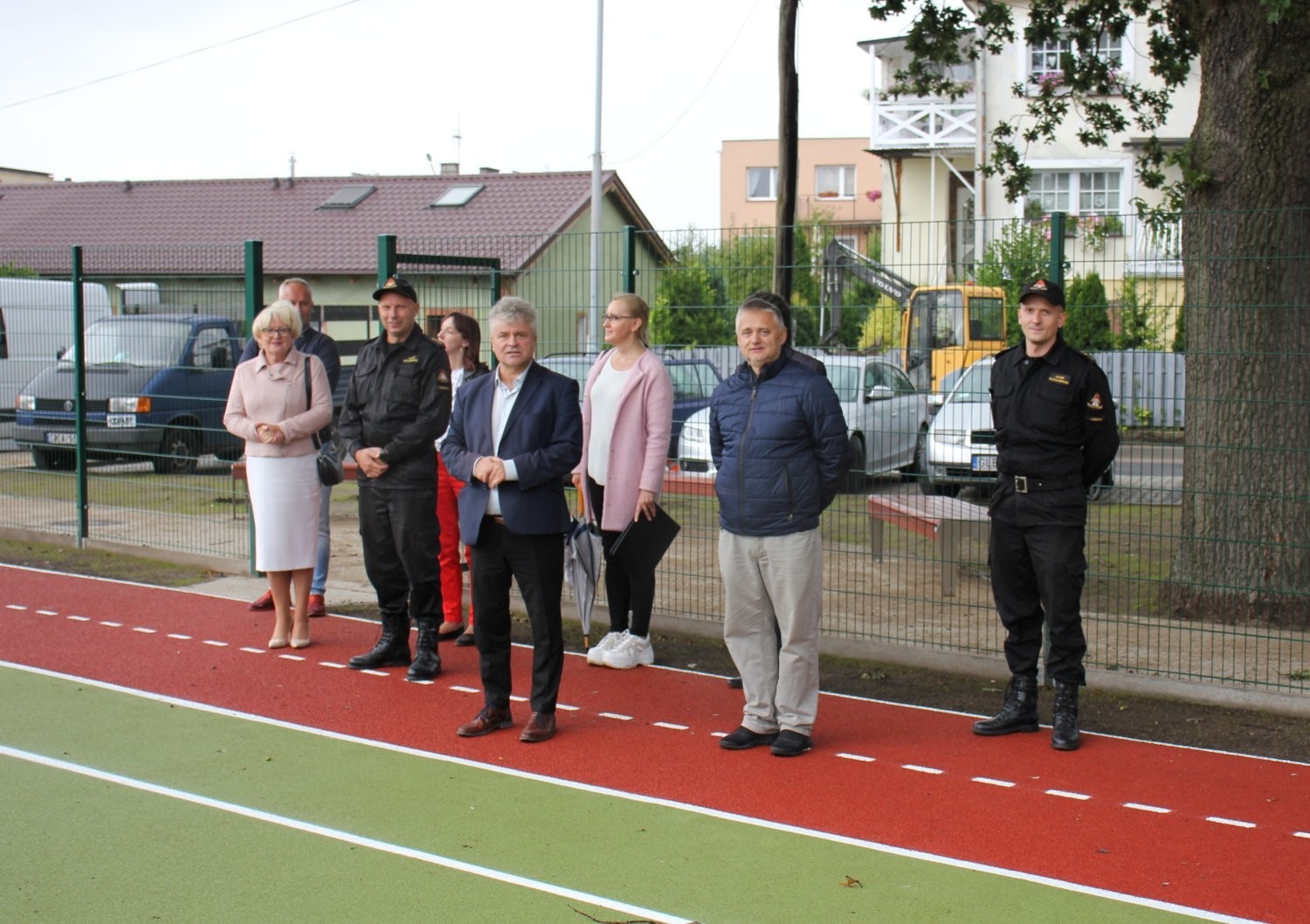 Teren inwestycji odwiedził Burmistrz Lęborka Witold Namyślak wraz z zastępcami, sekretarzem miasta i radnymi. Obecny był także Komendant PSP Lębork st. kpt. Piotr Krzemiński. Straż pożarna udostępniła część terenu pod boisko. Oprócz funkcji sportowo-rekreacyjnej nowe miejsce realizować będzie też funkcje edukacyjne. Wzdłuż bieżni rozmieszczone zostały tablice poglądowe dotyczące bezpieczeństwa pożarowego, które będą służyły celom edukacyjnym podczas wizyt dzieci w siedzibie Komendy Powiatowej Państwowej Straży Pożarnej w Lęborku.