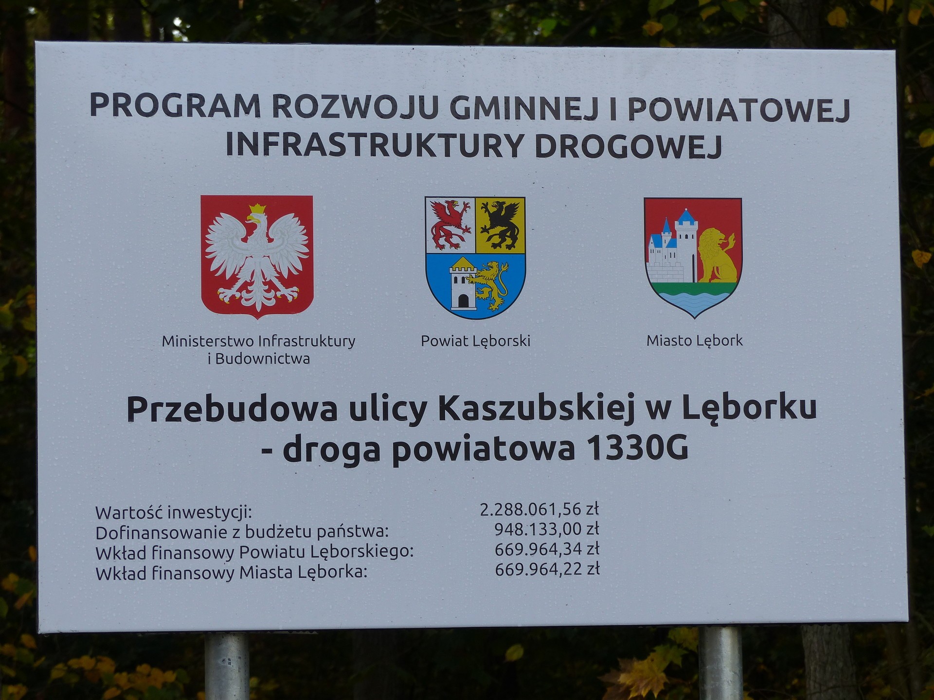 Inwestycja współfinansowana była przez 3 podmioty. Powiat Lęborski (669.964,34 zł), który odpowiadał za przeprowadzenie inwestycji, Miasto Lębork (669.964,22 zł) i budżet państwa (948.133 zł).