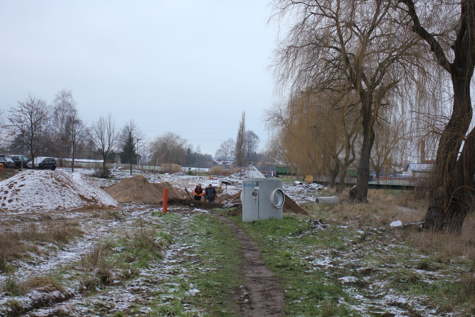 W pierwszym etapie przełożony został kolidujący z drogową inwestycją gazociąg, w kolejnym przełożona zostanie sieć teleinformatyczna. Roboty prowadzone są obecnie na przedłużeniu ulicy Głowackiego wzdłuż rzeki. W głębokich wykopach układana jest tam kanalizacja deszczowa pod przyszłą drogą. Pod koniec stycznia ma być zdjęta kładka przez rzekę. Piesi i rowerzyści w najbliższych miesiącach będą mogli skorzystać z pobliskiego mostu kolejowego. Ruch pociągów pasażerskich na trasie Lębork-Łeba-Lębork jest obecnie zawieszony.