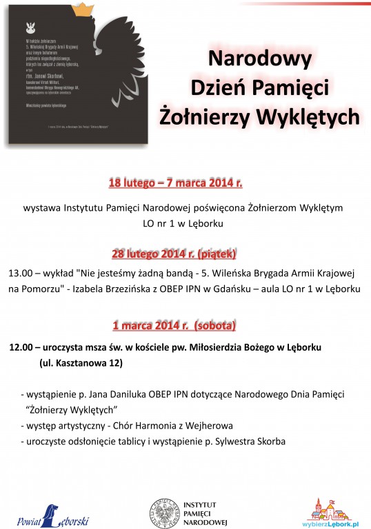 Burmistrz Miasta i Starosta Lęborski zapraszają na uroczystość odsłonięcia tablicy pamiątkowej poświęconej “Żołnierzom Wyklętym” na budynku kościoła pw. Miłosierdzia Bożego w Lęborku w dniu 1 marca 2014 r. o godz. 12.00.