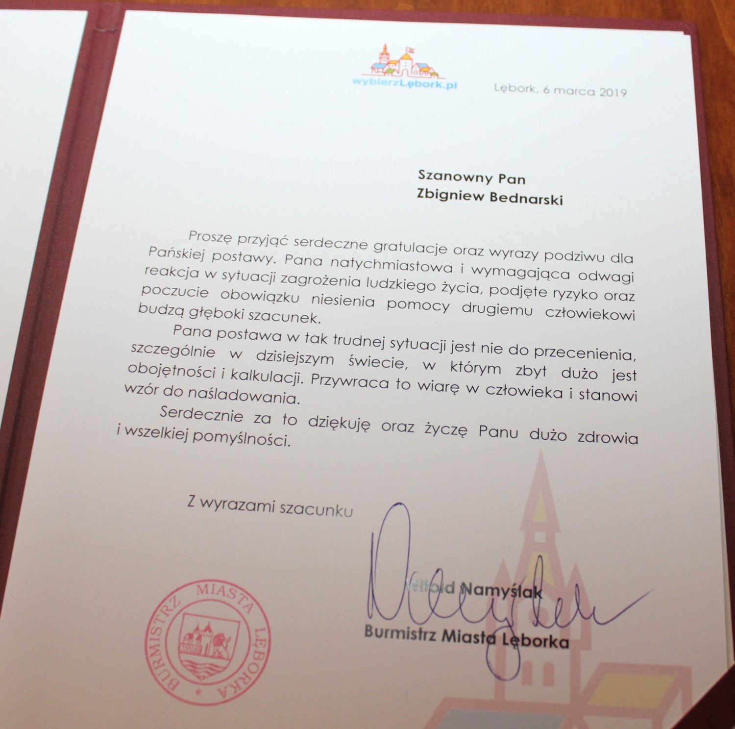 „Pana postawa w tak trudnej sytuacji jest nie do przecenienia, szczególnie w dzisiejszym świecie, w którym zbyt dużo jest obojętności i kalkulacji. Przywraca to wiarę w człowieka i stanowi wzór do naśladowania” napisał m.in. w liście gratulacyjnym wręczonym bohaterskiemu lęborczaninowi burmistrz Witold Namyślak. List gratulacyjny przekazał także Komendant Komendy Powiatowej w Lęborku kom. Mariusz Mejer.