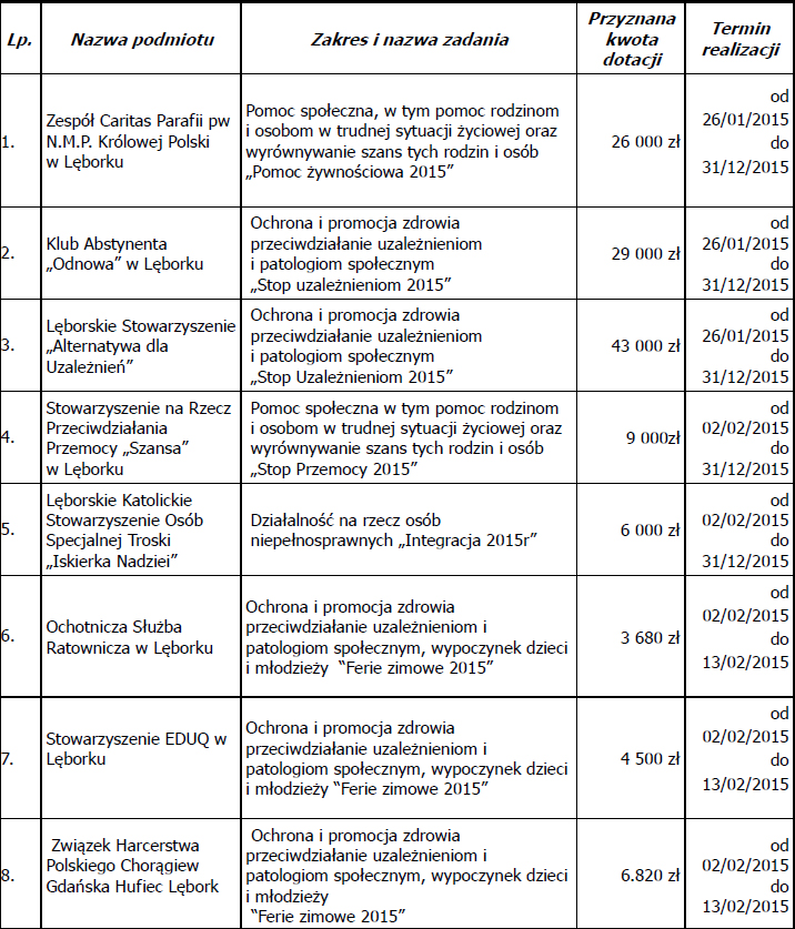 Na podstawie art. 15 ust. 2h i 2j ustawy z dnia 24 kwietnia 2003r. o działalności pożytku publicznego i o wolontariacie (tekst jednolity Dz. U. z 2014r., poz. 1118 ze zm.) Burmistrz Miasta Lęborka zawiadamia o wynikach otwartych konkursów ofert na realizację zadań publicznych na 2015 rok: