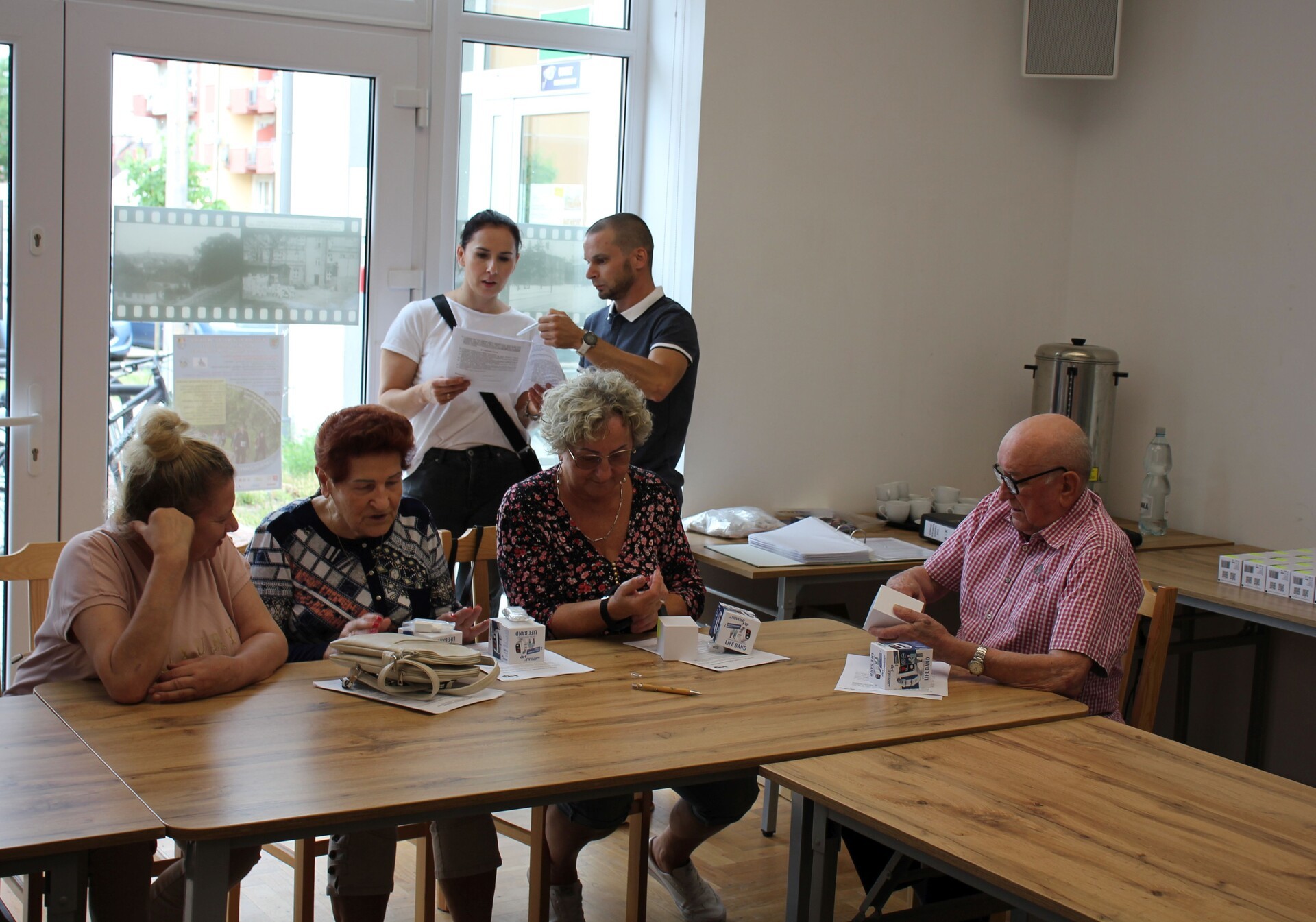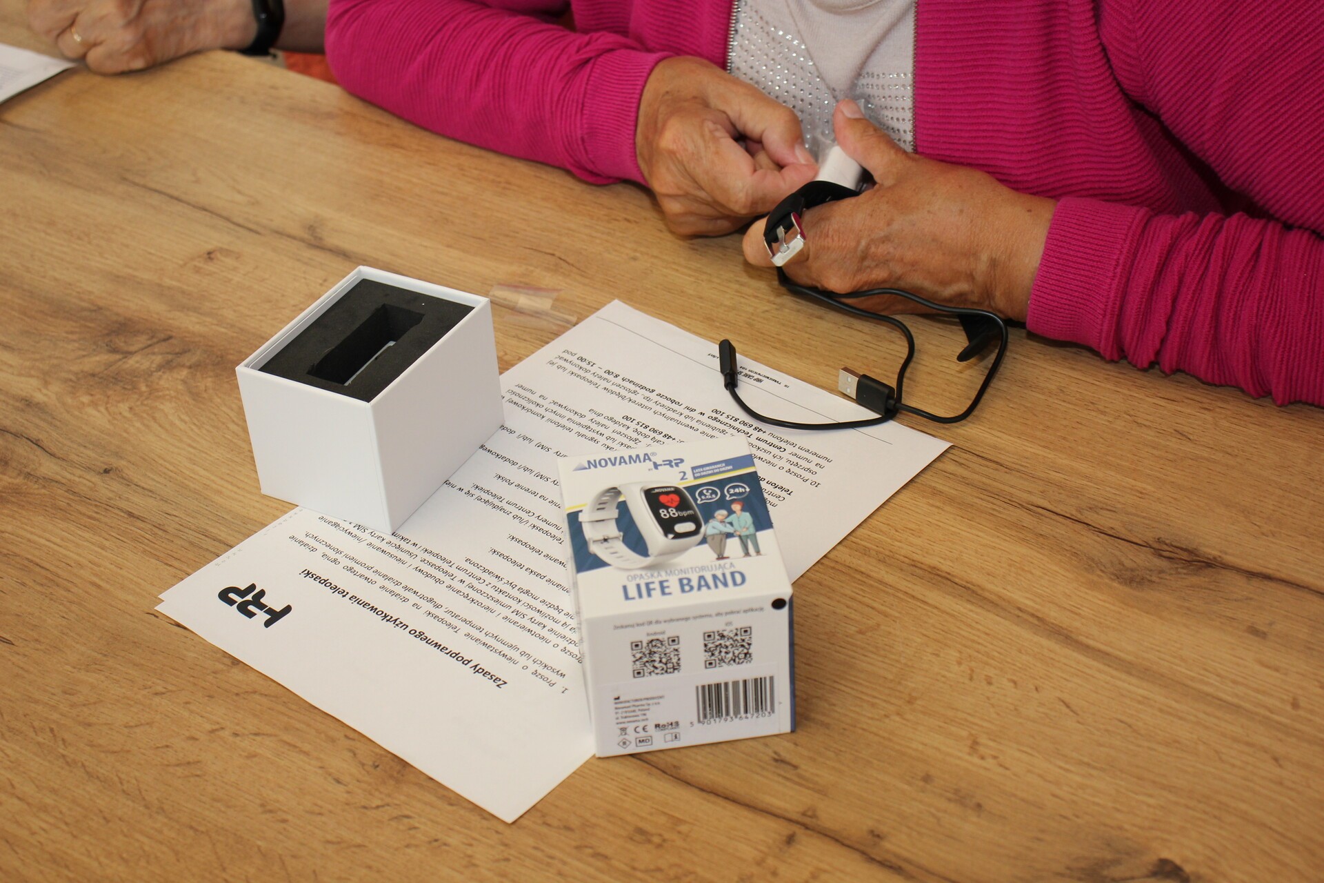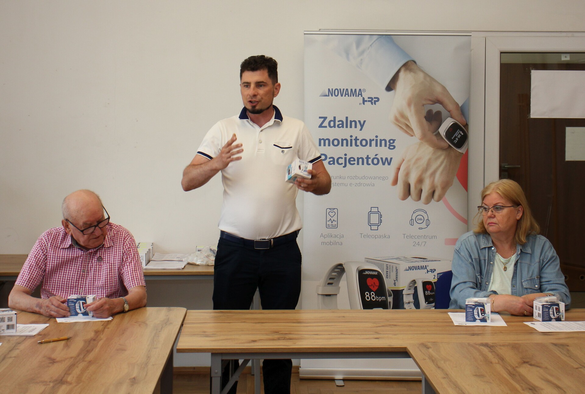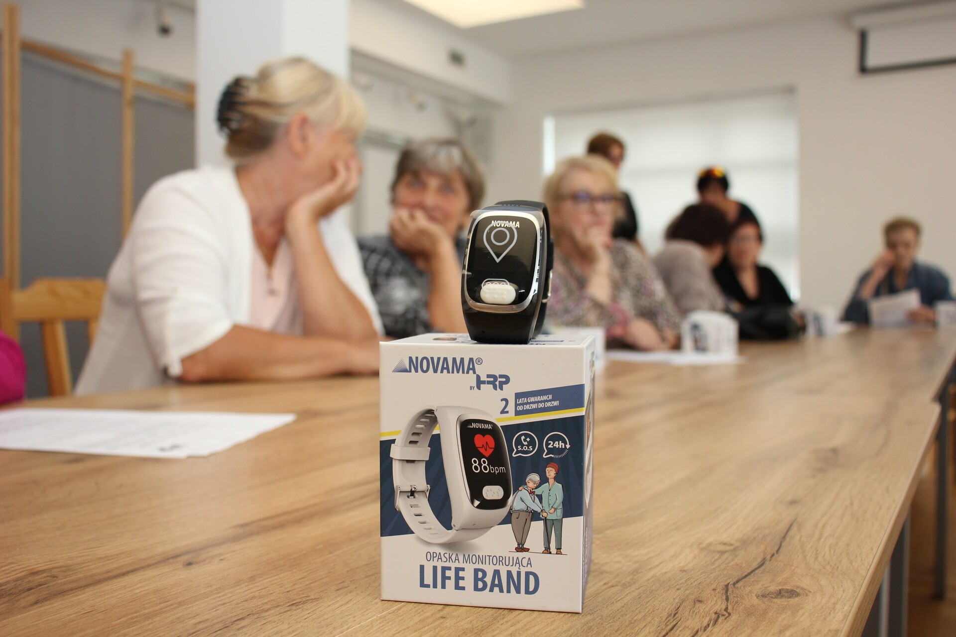 Na spotkaniu z udziałem przedstawiciela firmy dostarczającej opaski oraz kierownik MOPS Elżbiety Michalskiej przeprowadzono szkolenie dla seniorów z zakresu obsługi urządzenia oraz jego podstawowych funkcjonalności. Opaska posiada przycisk SOS, który łączy się z całodobowym telecentrum opieki, detektor upadku, lokalizator GPS oraz mierzy w czasie rzeczywistym puls, ciśnienie, saturację i temperaturę. Poprzez aplikacje odczyty z opaski mogą być śledzone w telefonie przez seniora lub bliską mu osobę.