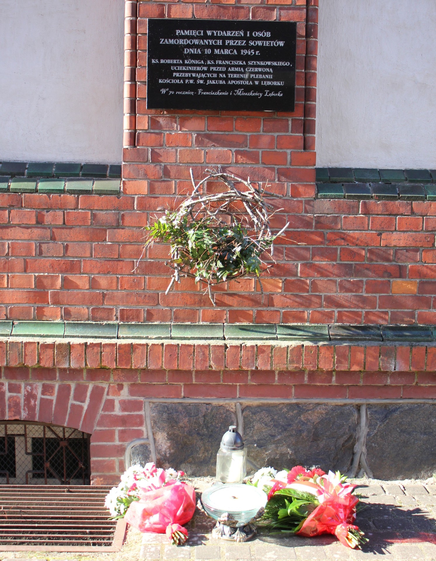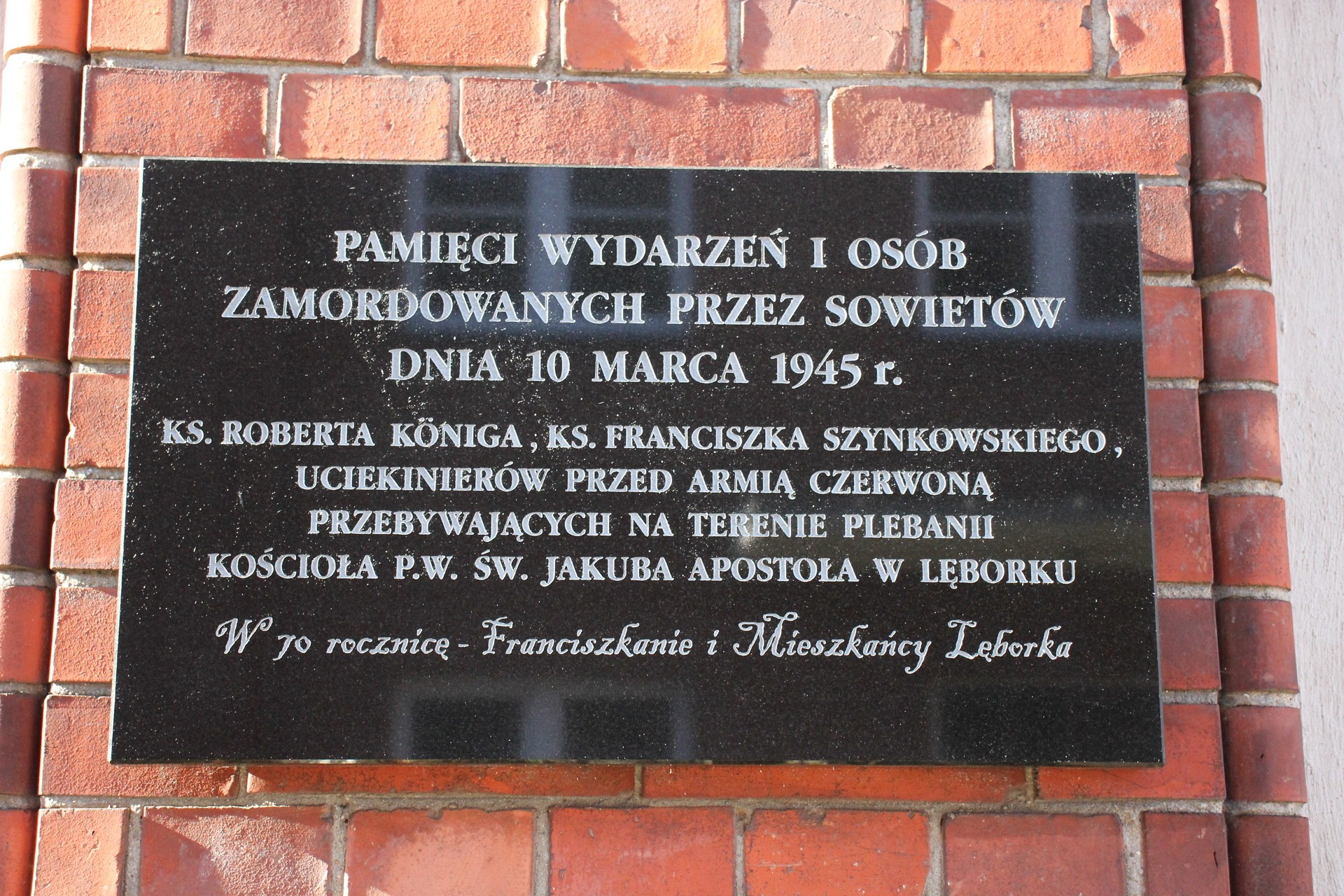 Po mszy i krótkiej modlitwie złożono kwiaty i zapalono znicze pod tablicą umieszczoną na budynku klasztoru parafii św. Jakuba Ap. Napis na tablicy brzmi: „Pamięci wydarzeń i osób zamordowanych przez Sowietów 10 marca 1945: ks. Roberta Königa, ks. Franciszka Szynkowskiego, uciekinierów przed Armią Czerwoną przebywających na terenie plebanii kościoła”.