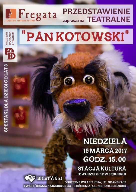 Lęborskie Centrum Kultury „Fregata” zaprasza na kolejne przedstawienie z cyklu „Niedzielne spotkania z teatrem”. 19 marca o godz. 15.00 Teatr Lalki Tęcza zaprezentuje w Stacji Kultura (dworzec PKP, ul. Dworcowa 8) przedstawienie pod tytułem „Pan Kotowski”. Bilety w cenie 8 zł dostępne są w kasie kina przy ul. Gdańskiej oraz w CIT przy alei Niepodległości 6. Liczba biletów jest ograniczona. Spektakl przewidziany dla widzów od lat 3.