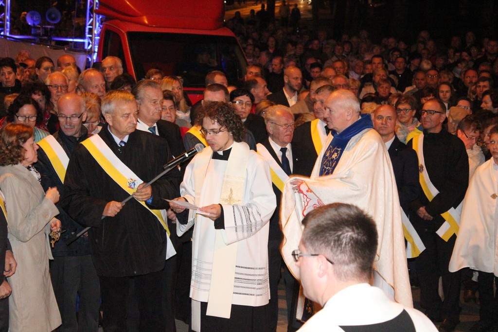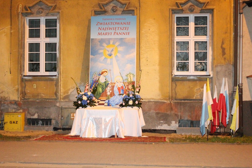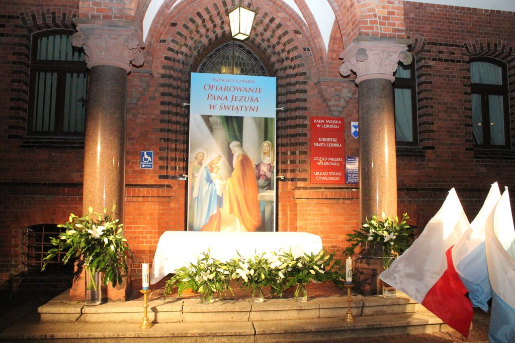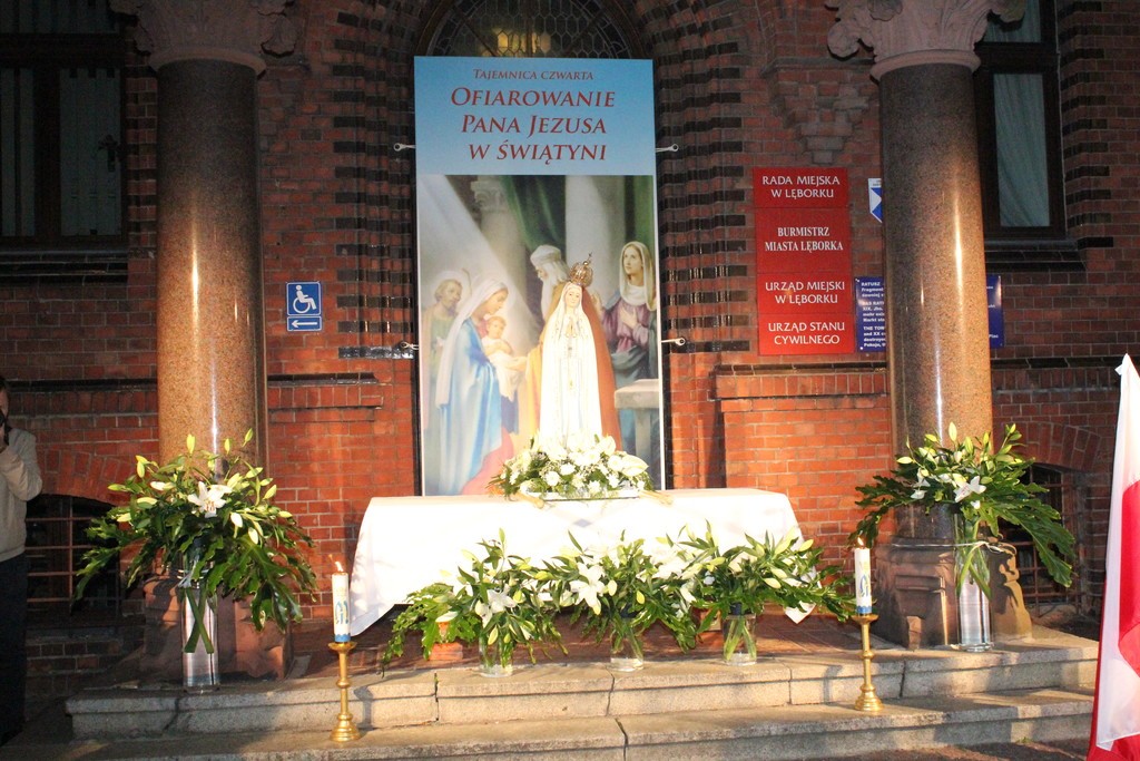Czwarta stacja różańcowa "Zawierzenie miasta Lęborka" przygotowana została przy budynku ratusza. Przygotowały je parafie św. Jadwigi Śląskiej i Miłosierdzia Bożego wraz z pracownikami Urzędu Miejskiego. W nocy i rano przy Figurze Matki Bożej Fatimskiej będzie trwało całonocne czuwanie wiernych z wszystkich parafii Dekanatu Lęborskiego.