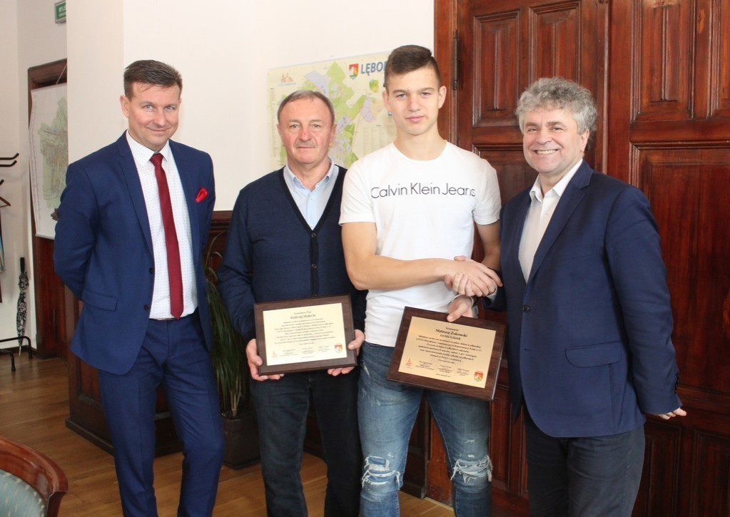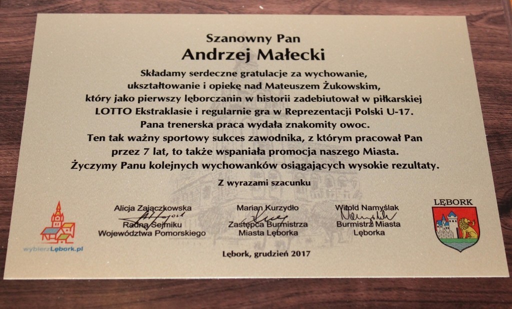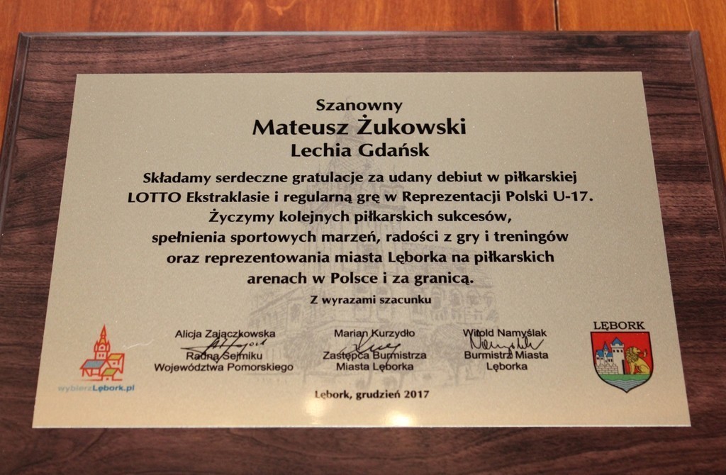 16 lat i 24 dni potrzebował Mateusz Żukowski by zadebiutować w piłkarskiej Ekstraklasie. Młody napastnik Lechii Gdańsk jest pierwszym lęborczaninem w historii grającym na tym poziomie rozgrywek. Wychowanka Pogoni Lębork i UKS Trójki oraz pierwszego trenera Andrzeja Małeckiego pamiątkowymi grawertonami uhonorował Burmistrz Lęborka Witold Namyślak i jego zastępca Marian Kurzydło.