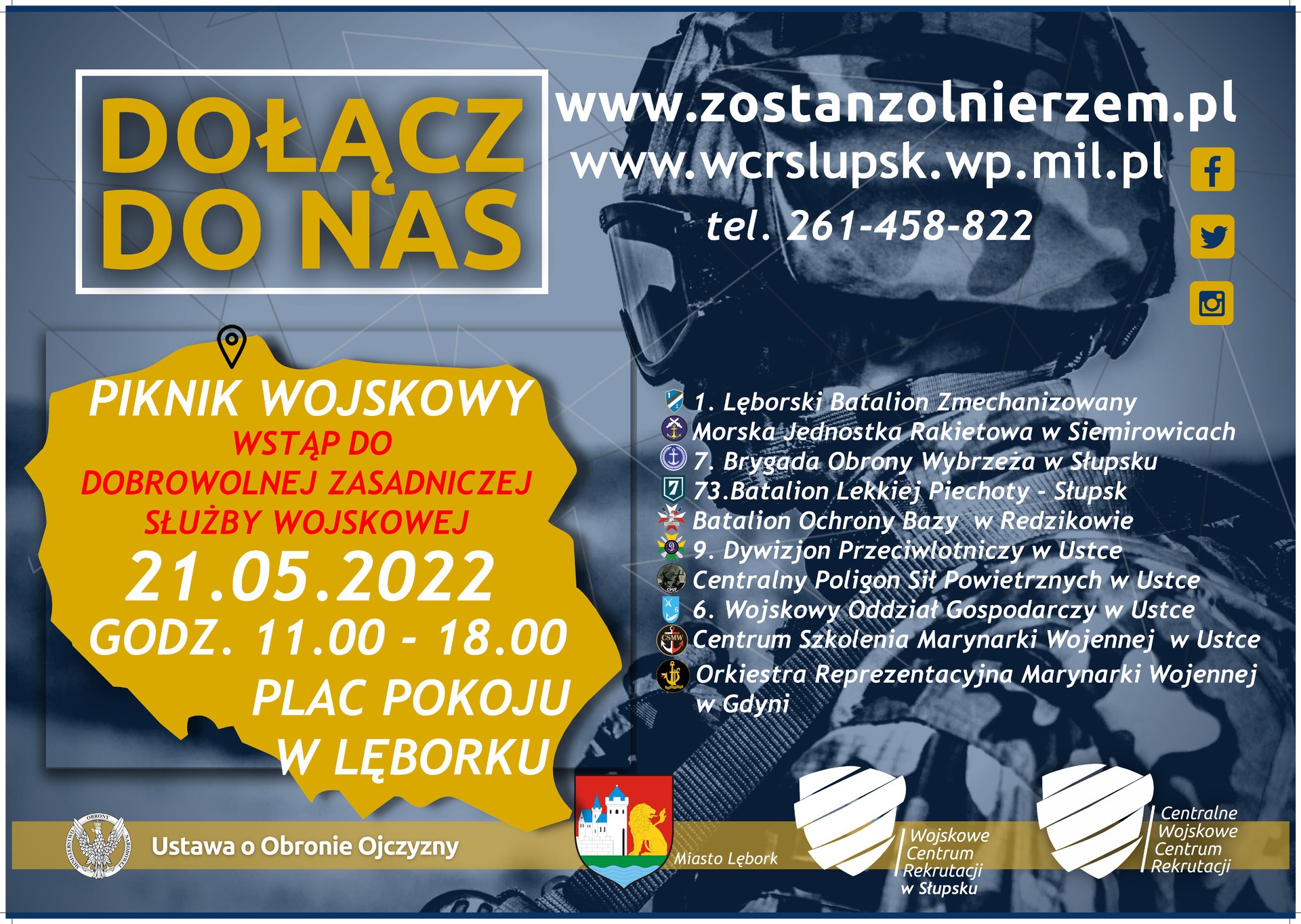 "Wstąp do dobrowolnej zasadniczej służby wojskowej" - pod takim hasłem w sobotę 21 maja o godz. 11.00 rozpocznie się w Lęborku, podobnie jak w 31 innych miejscach w kraju się Piknik Wojskowy. Oprócz pokazu sprzętu wojskowego i żołnierskiej grochówki na Placu Pokoju działać w tym dniu będą punkty rekrutacyjne, w których będzie można uzyskać informacje o dobrowolnej zasadniczej służbie wojskowej: ile trwa, kto może do niej przystąpić i na czym polega. Na miejscu można będzie wypełnić wniosek o powołanie (dlatego warto zabrać dowód osobisty).