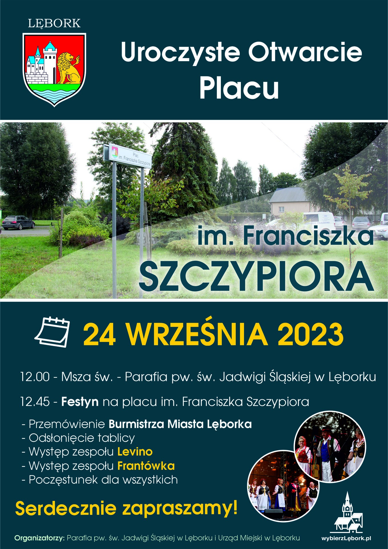 Witold Namyślak Burmistrz Miasta Lęborka oraz ks. Sławomir Prabucki proboszcz Parafii św. Jadwigi Śląskiej w Lęborku zapraszają na uroczyste otwarcie placu im. Franciszka Szczypiora. Wydarzenie odbędzie się w niedzielę 24 września br. i rozpocznie się o godz. 12.00 mszą św. w kościele pw. Św. Jadwigi Śląskiej. Następnie, po mszy, nastąpi uroczyste odsłonięcie tablicy oraz festyn dla mieszkańców miasta.