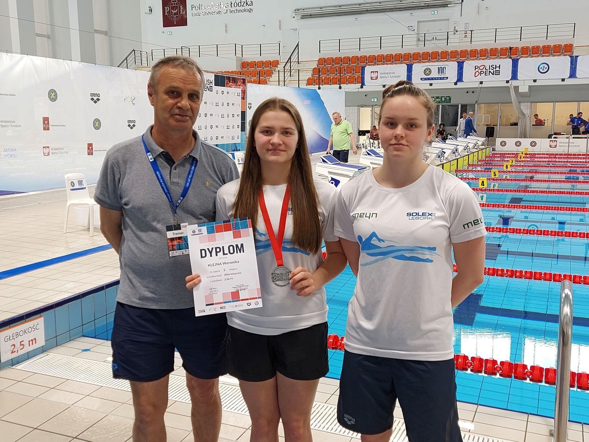Na zdjęciu Weronika Klejna ze srebrnym medalem, Hania Walkusz i trener Dariusz Gromulski na 50-metrowej pływalni Politechniki Łódzkiej.