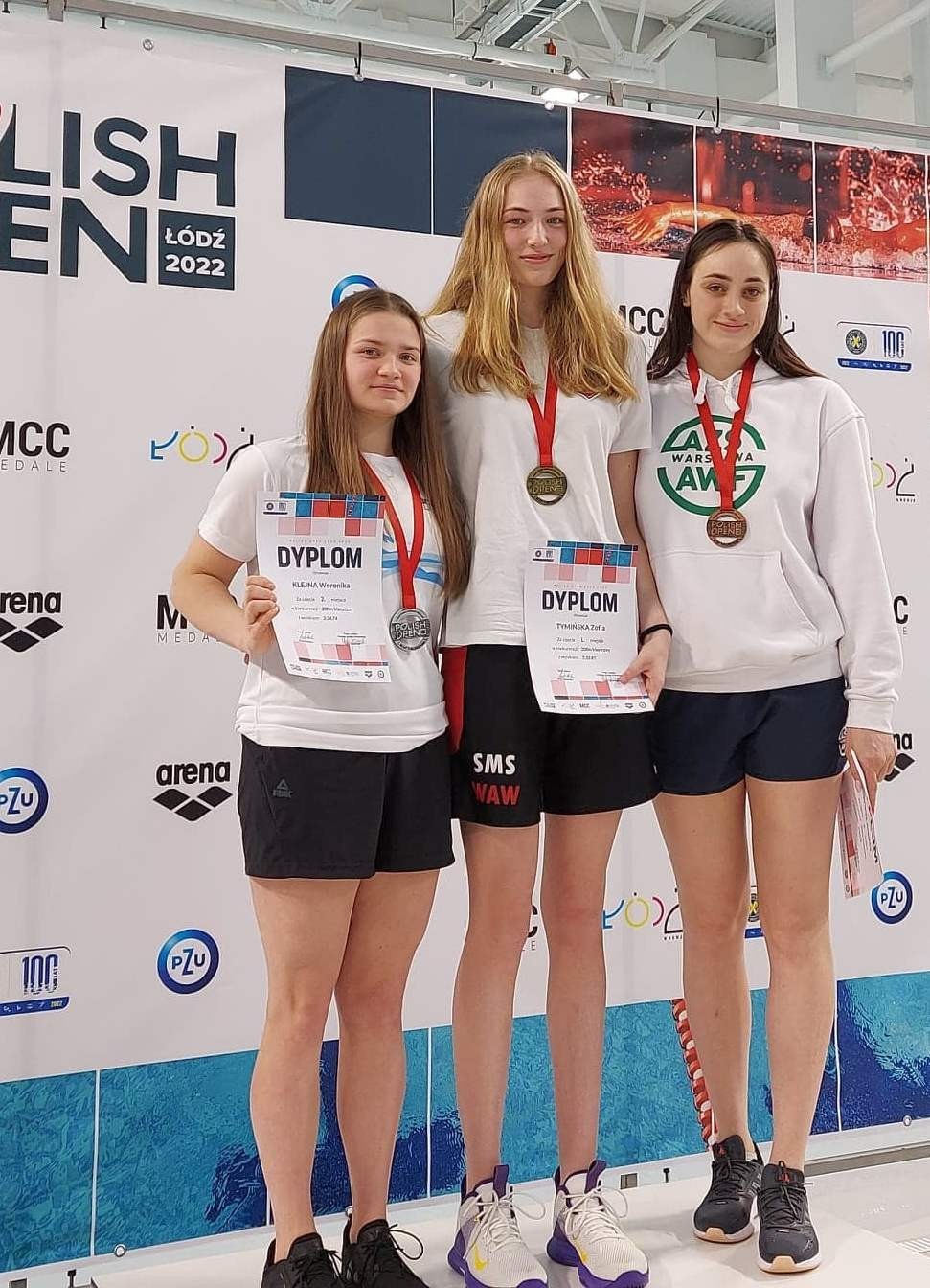 Zwyciężczynie na dystansie 200m stylem klasycznym na podium. Pierwsze miejsce Zofia Tymińska Polonia Warszawa, drugie miejsce Weronika Klejna Meyn Solex Lębork. Trzecie miejsce Angelika Wikieł AZS AWF Warszawa.
