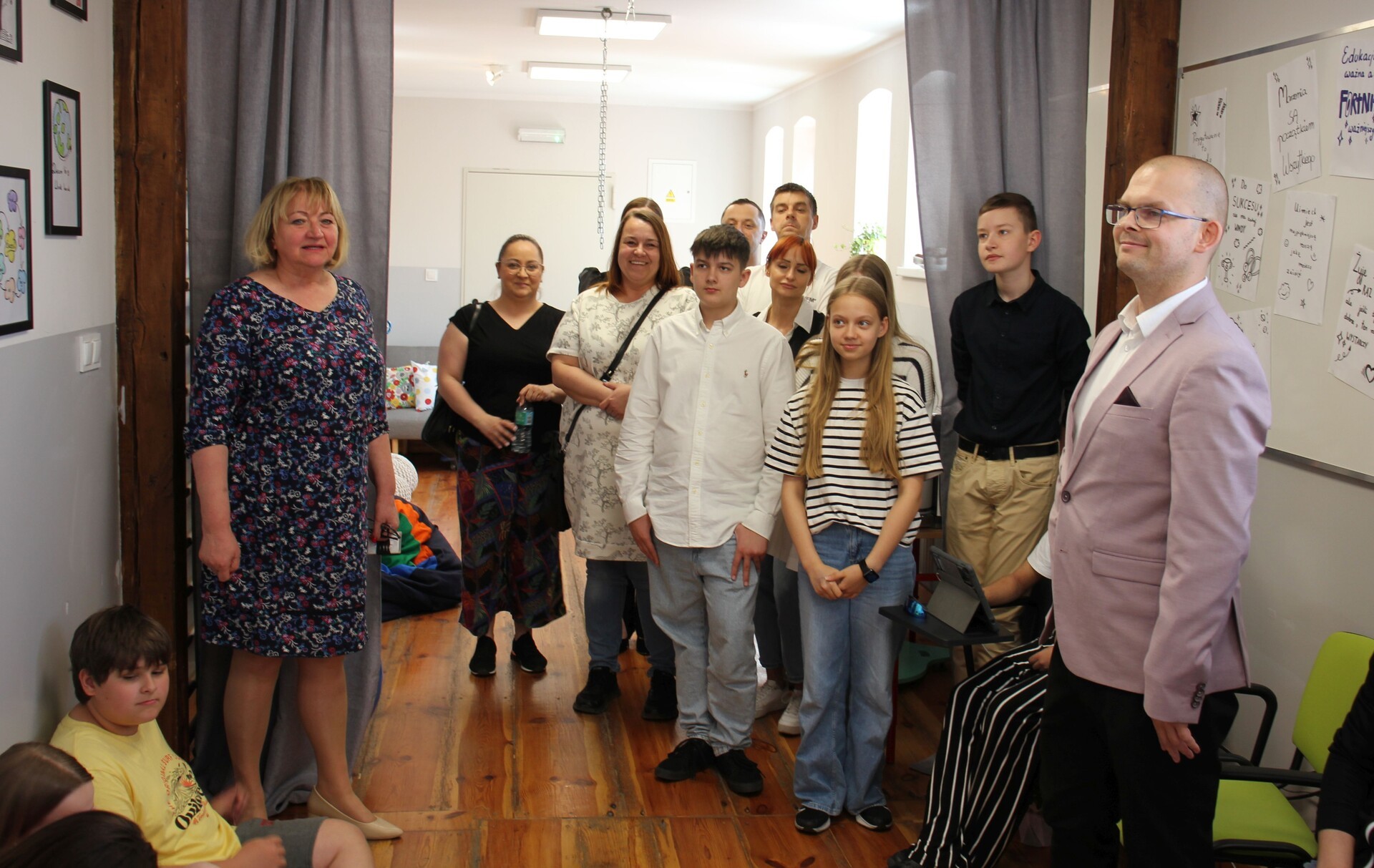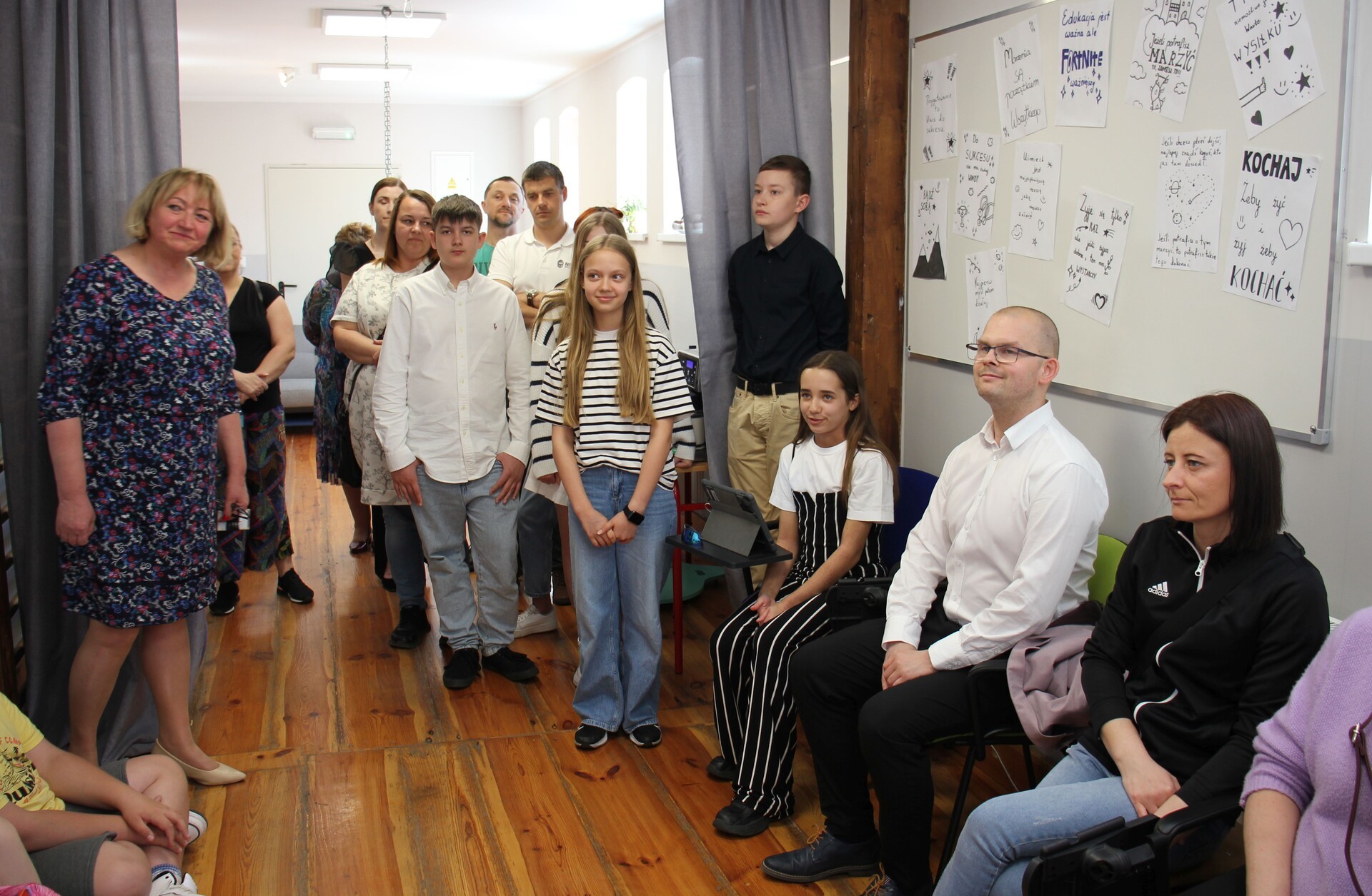 Ideę nowej sali i drogę do jej powstania opowiedzieli w formie prezentacji w obecności burmistrza Lęborka Jarosława Litwina, dyrektor Marioli Małeckiej oraz nauczycieli i rodziców uczniowie zespołu projektowego Kółko Krzyżyk (klasa 5m i 6b). Grupa przygotowała również słodki poczęstunek.
