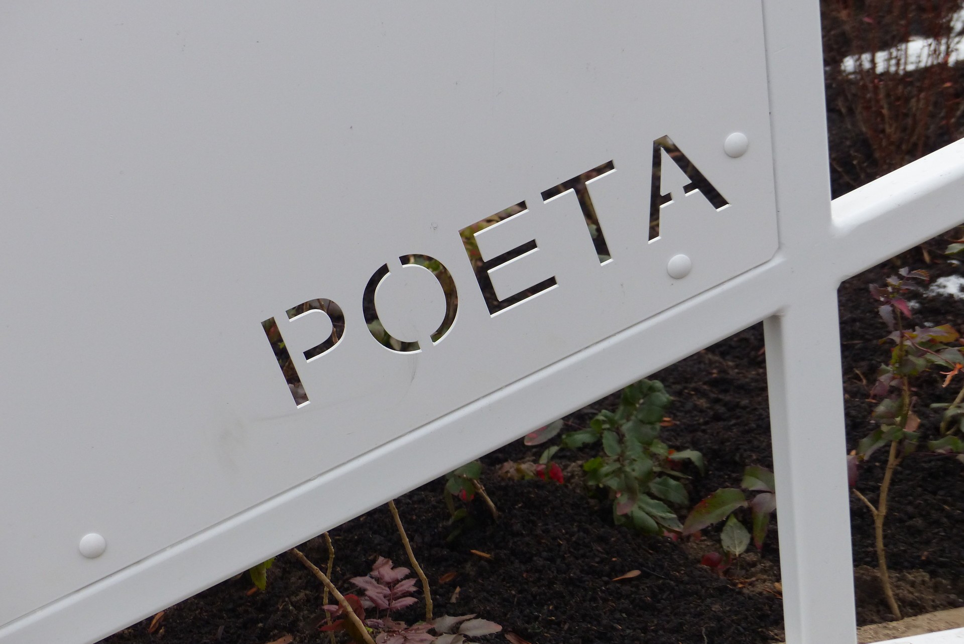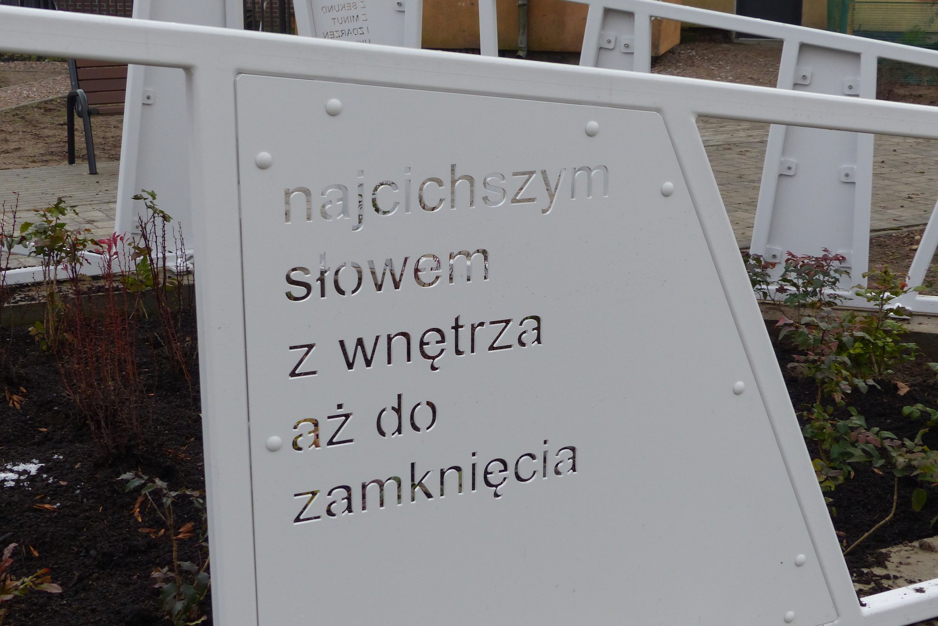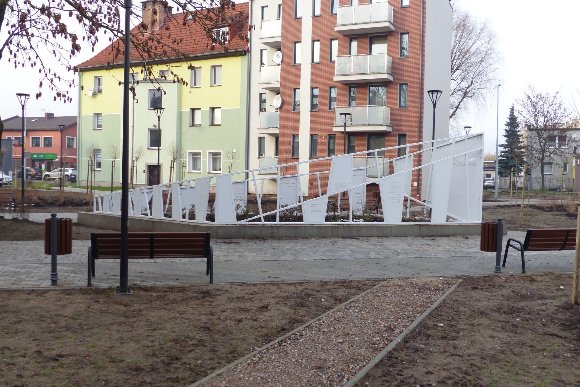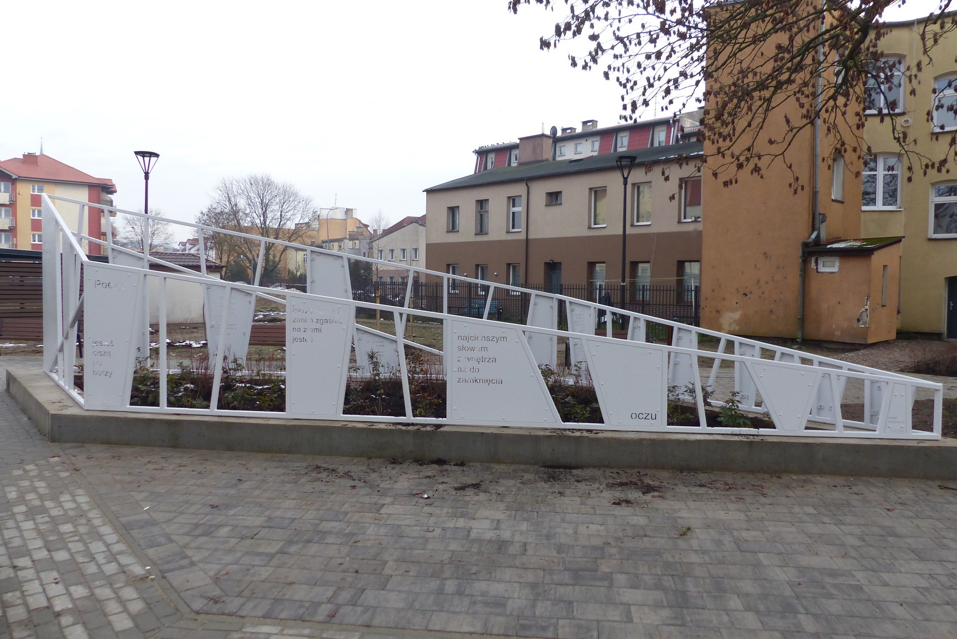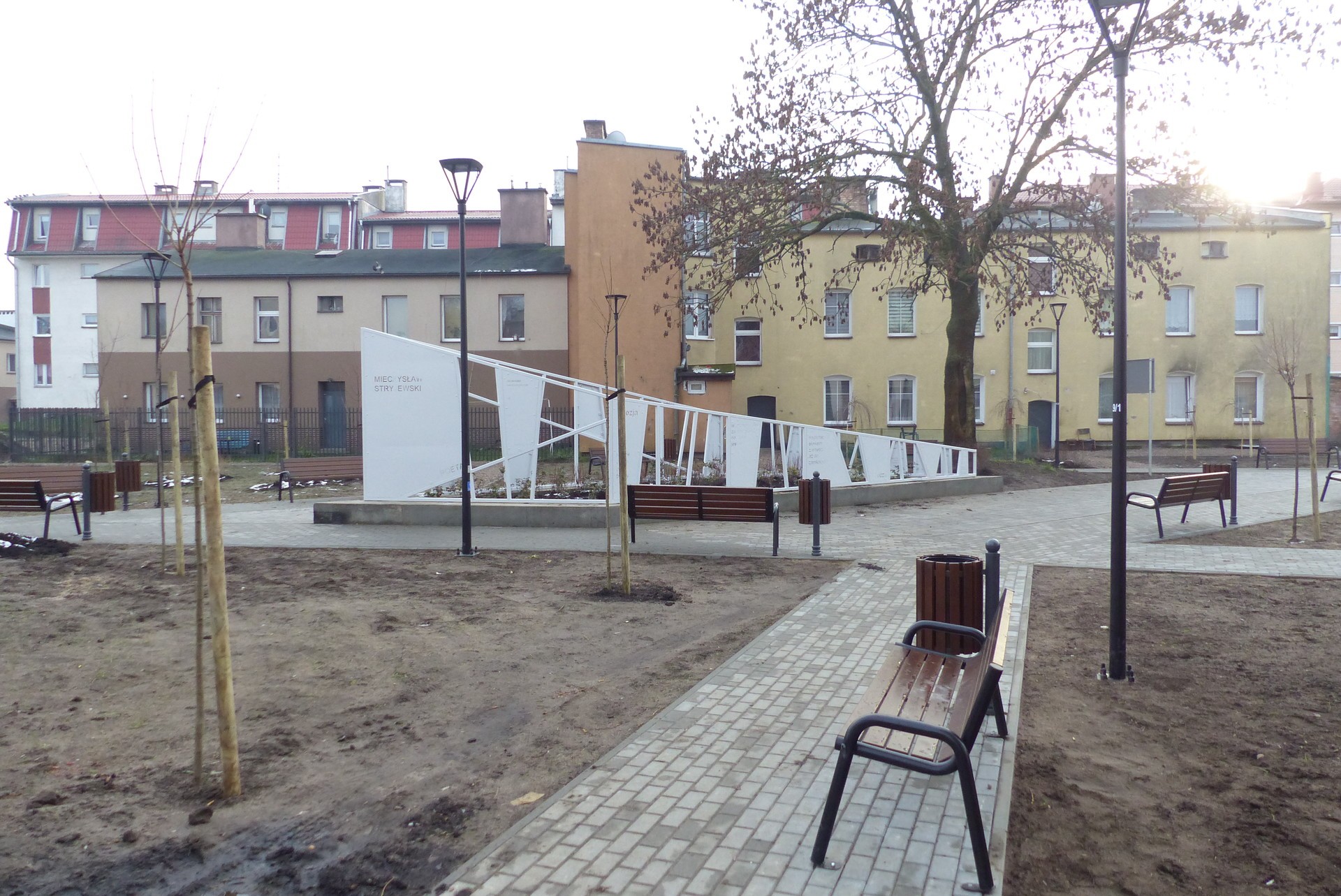 Ważnym elementem nowego skweru jest pomalowany na biało lekki stalowy monument z płytami, na których laserowo wycięto cytaty z twórczości Mieczysława Stryjewskiego.