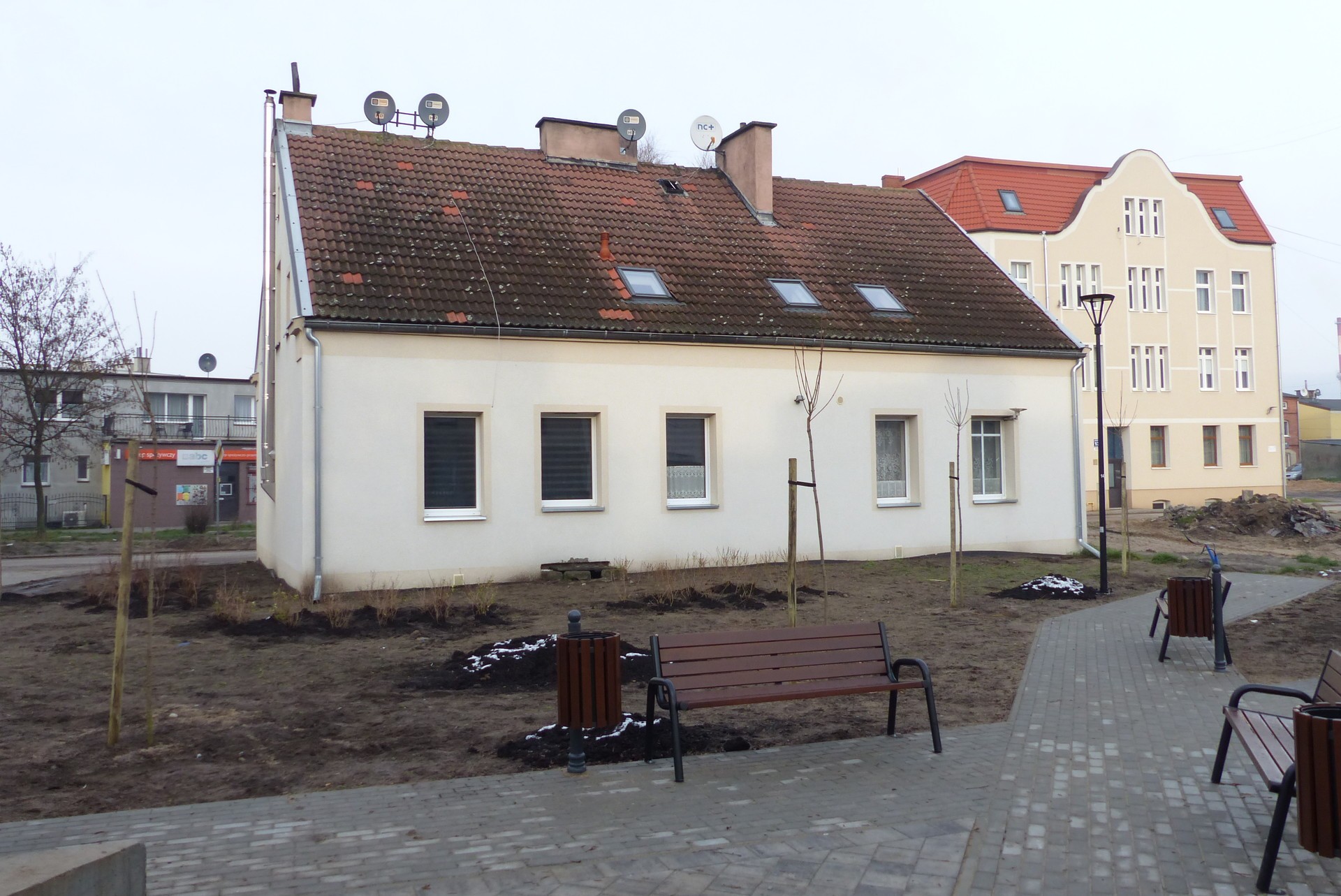 W ramach aranżacji terenu wytyczono chodniki i dojścia do budynków, ustawiono ławki i śmietniki, postawiono lampy. Wykonano też wiele nasadzeń zieleni (drzewa, krzewy i krzewinki, trawa). Co ważne, projekt uwzględnił zachowanie stojącego na podwórzu drzewa. Całość uzupełnia duża i estetyczna wiata śmietnikowa. Koszt budowy podwórka integracyjnego wyniósł 377 tys. złotych.