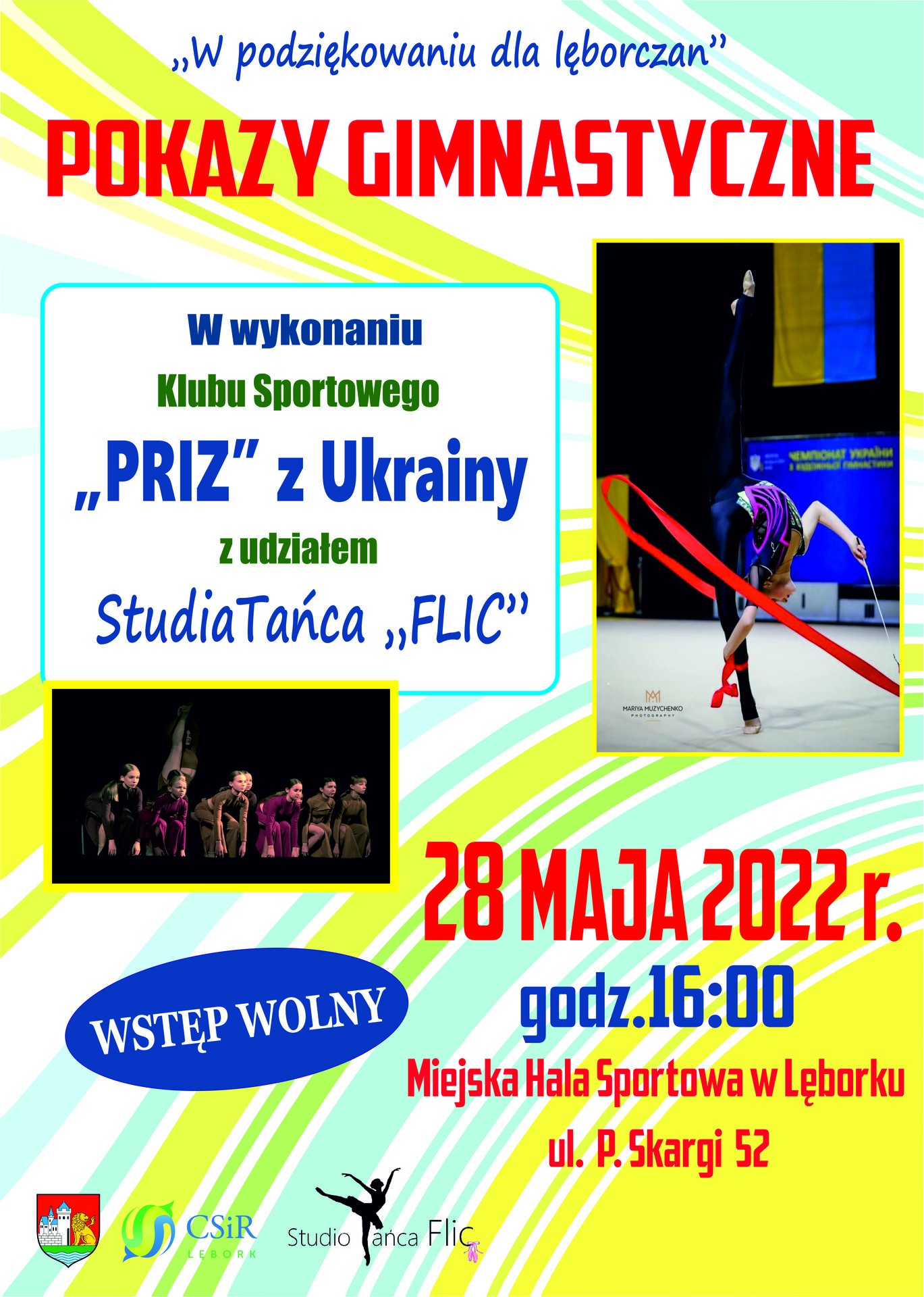 Pokazy gimnastyczne odbędą się w dniu 28 maja 2022 r. (sobota) w Miejskiej Hali Sportowej przy ul. P. Skargi 52 o godz. 16:00.