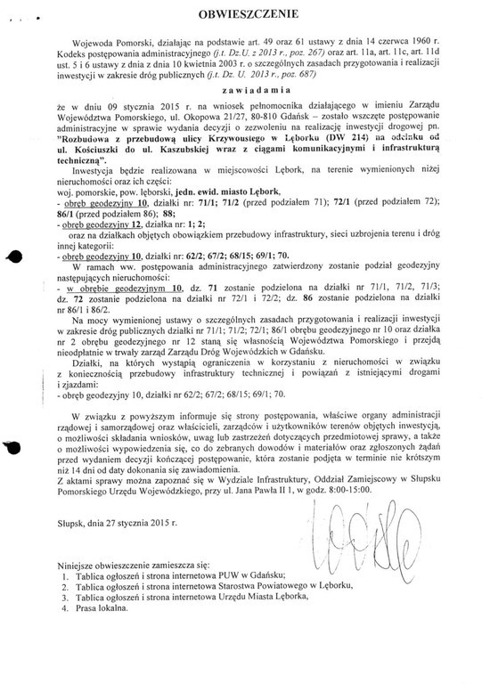 Pomorski Urząd Wojewódzki Oddział Zamiejscowy w Słupsku Wydział Infrastruktury informuje o wszczęciu przez Wojewodę Pomorskiego postępowania administracyjnego w sprawie wydania decyzji o zezwoleniu na realizację inwestycji drogowej pn. „Rozbudowa z przebudową ulicy Krzywoustego w Lęborku (DW214) na odcinku od ul. Kościuszki o ul. Kaszubskiej wraz z ciągami komunikacyjnymi i infrastrukturą techniczną”.