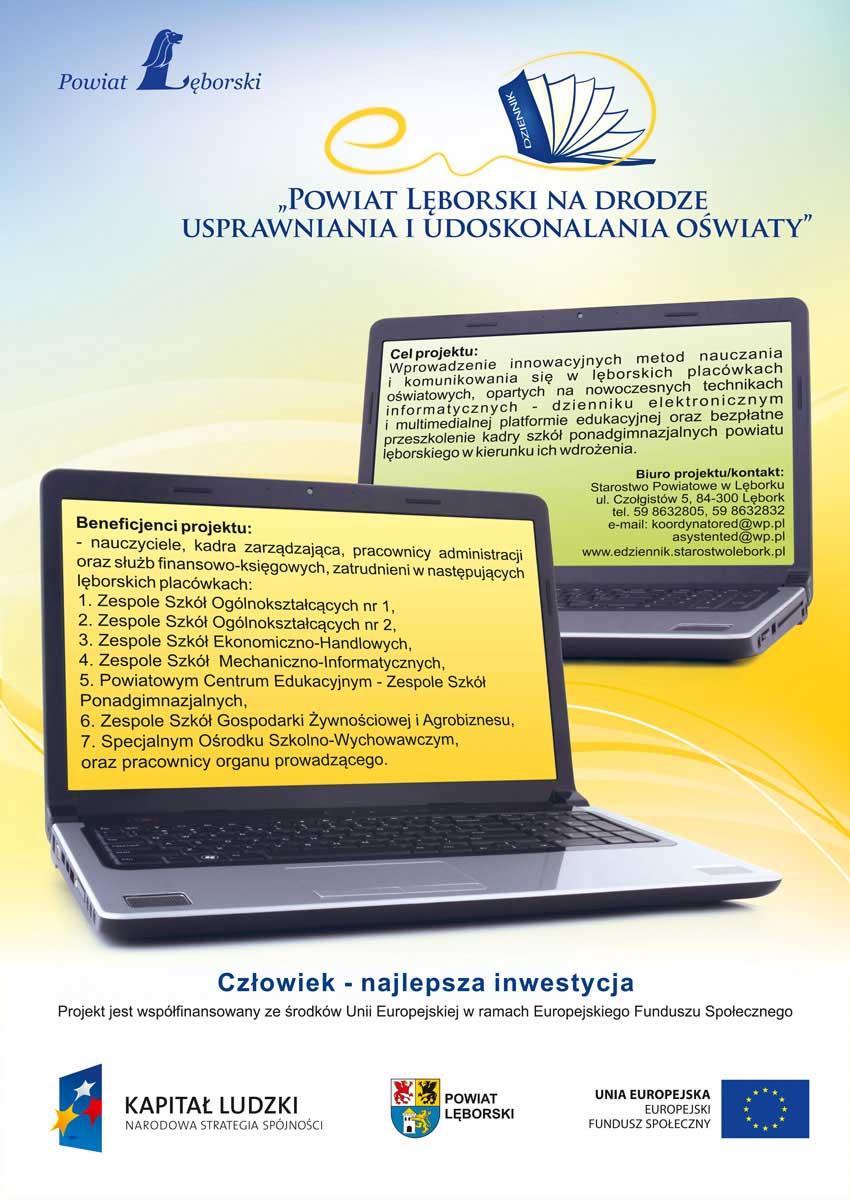 Powiat Lęborski realizuje projekt pn. „Powiat Lęborski na drodze usprawniania i udoskonalania oświaty". Projekt współfinansowany jest ze środków Europejskiego Funduszu Społecznego Programu Operacyjnego Kapitał Ludzki.