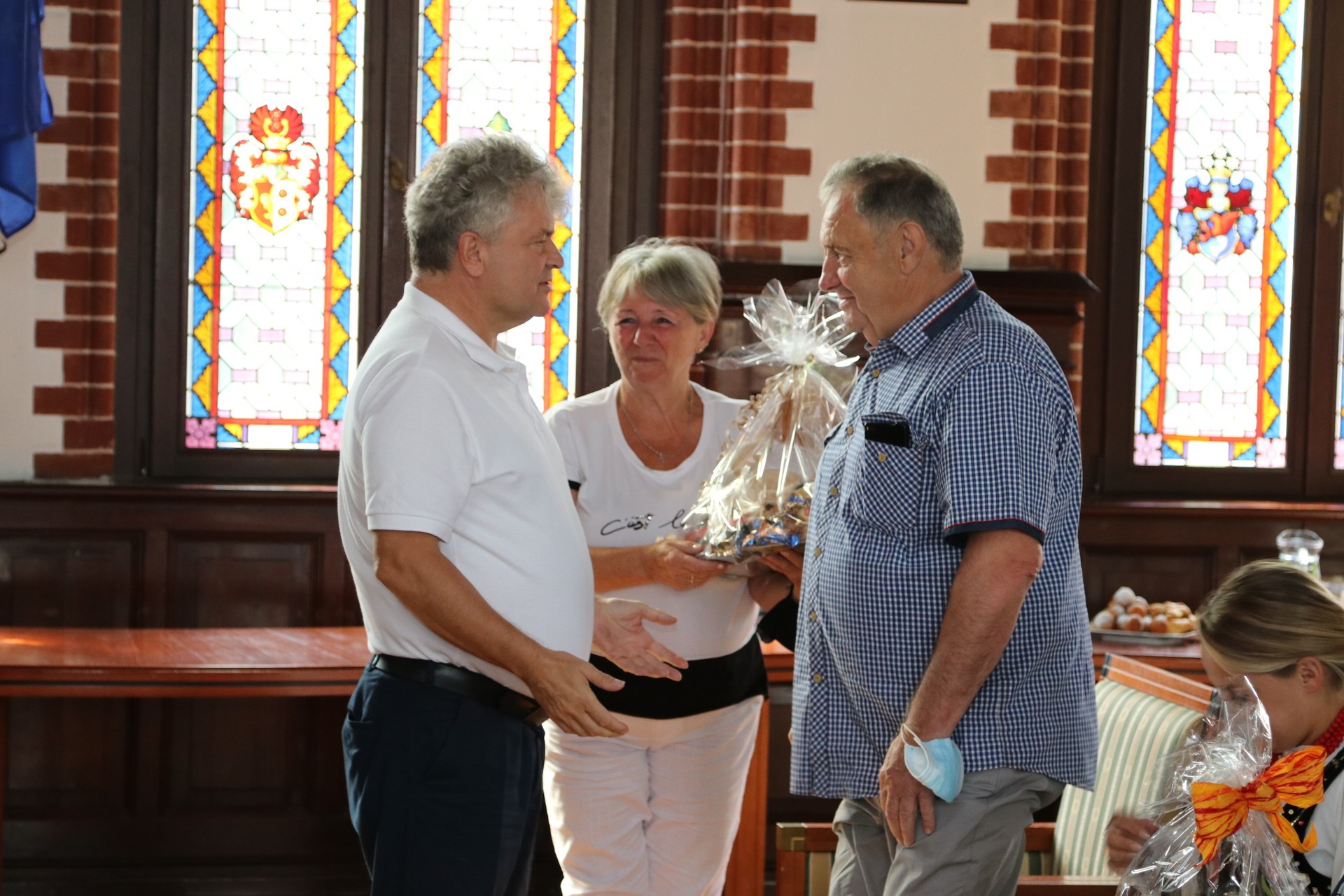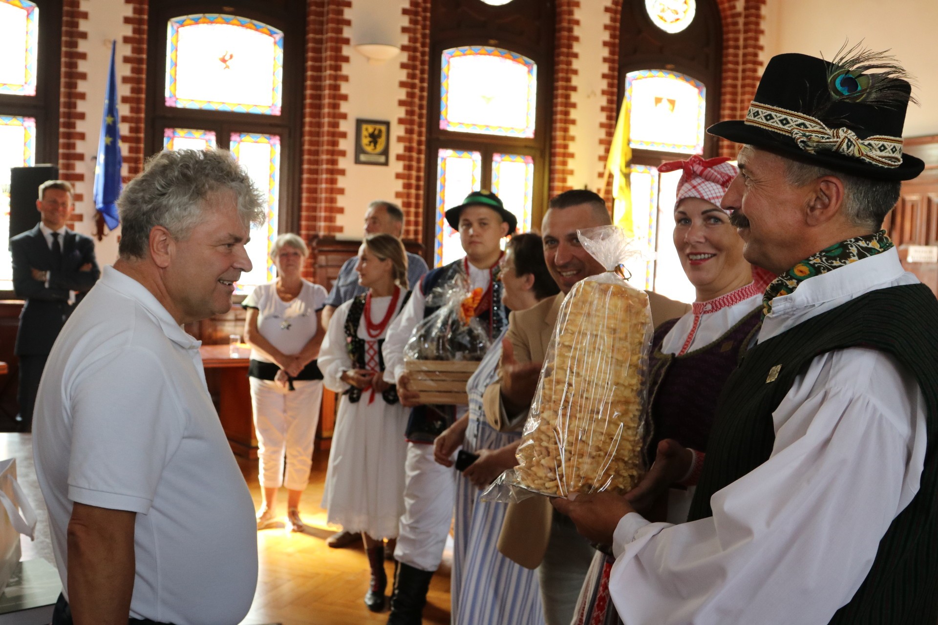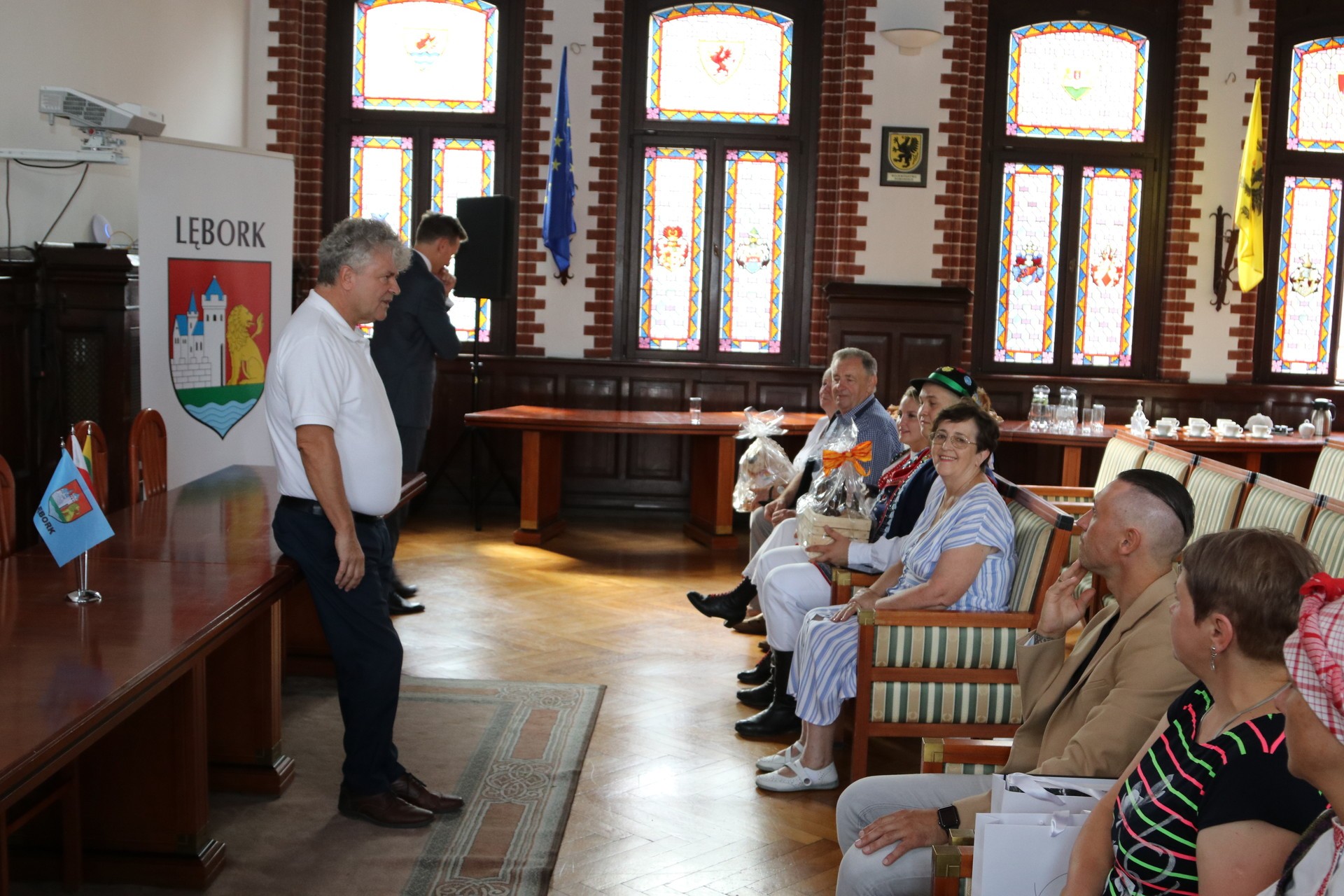 Zespoły powitał w naszym mieście Burmistrz Lęborka Witold Namyślak z Sekretarzem Miasta Marianem Kurzydło. Goście i gospodarze wymienili się drobnymi upominkami.