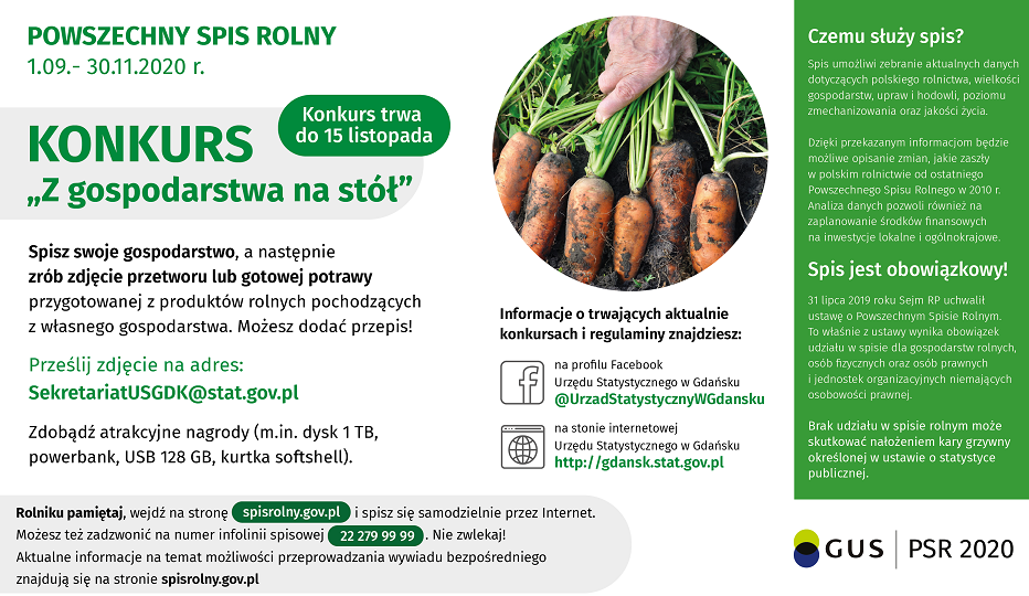 Więcej informacji i regulamin: https://gdansk.stat.gov.pl/aktualnosci/powszechny-spis-rolny-2020-konkurs-z-gospodarstwa-na-stol,234,1.html