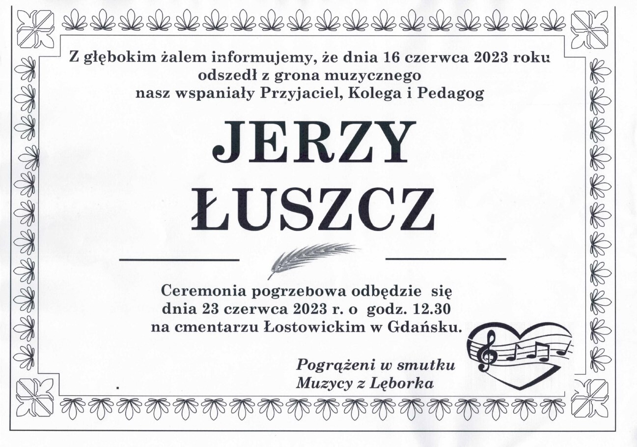 Odszedł Jerzy Łuszcz, człowiek związany z Lęborkiem od lat pięćdziesiątych ubiegłego stulecia, uczestnik i kreator życia muzycznego naszego miasta, opiekun młodych talentów, Pedagog, który rozwijał w nich wrażliwość na słowo i nuty.