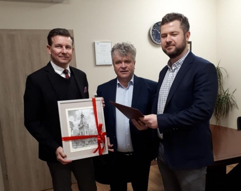 Gratulacje Prezesowi Zarządu PPH AMG Maciejowi Babijowi wraz z pamiątkową grafiką Lęborka złożył Burmistrz Miasta Witold Namyślak i Sekretarz Marian Kurzydło.