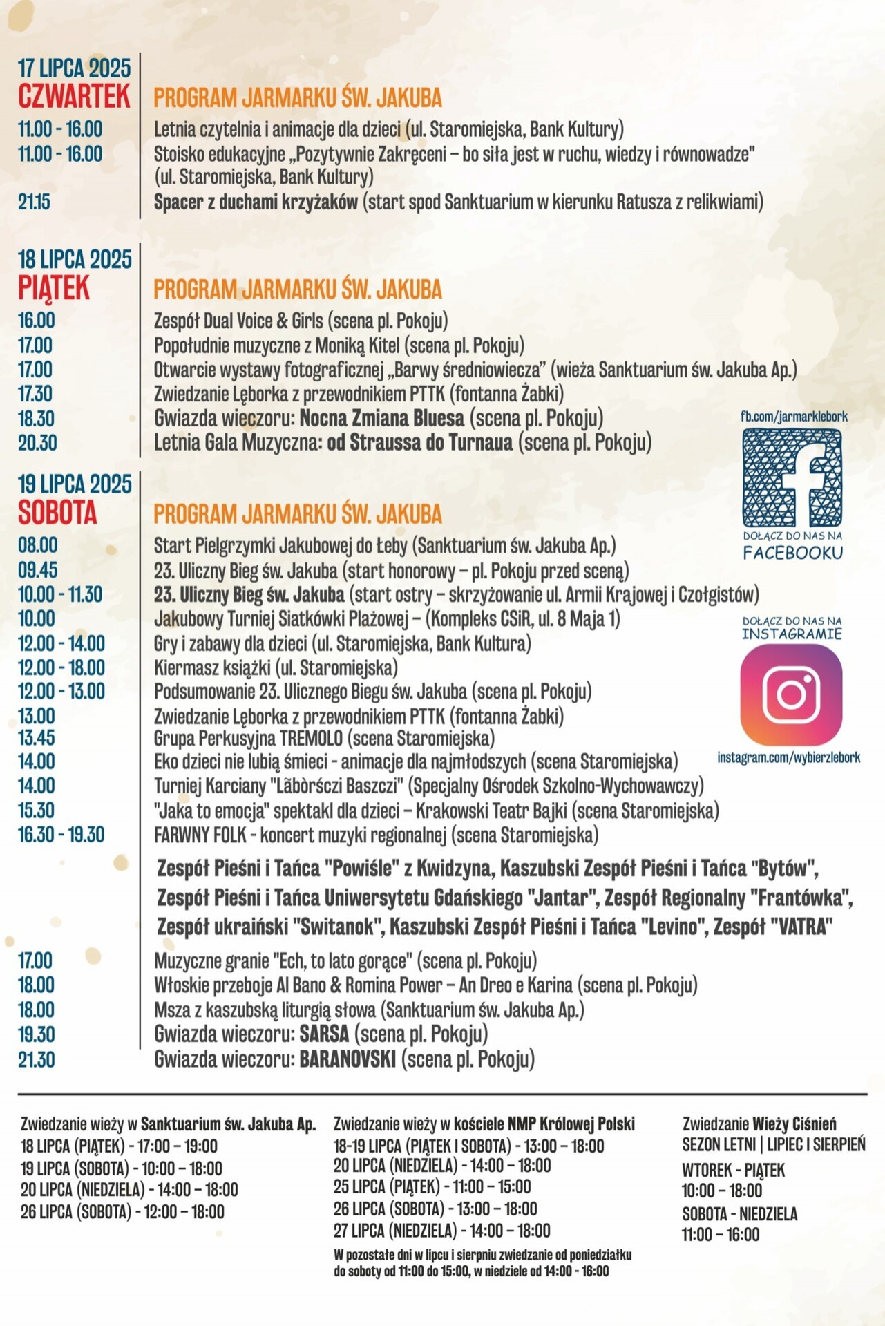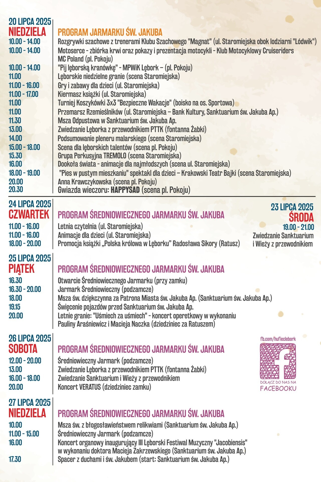 Startujemy z programem Jarmarku św. Jakuba 2025! Czas odkryć, co szykujemy na najgorętsze dni tego lata w Lęborku! Przed Wami oficjalna premiera programu Jarmarku św. Jakuba – wydarzenia, które połączy tradycję z nowoczesnością, historię z muzyką, średniowiecznych rycerzy z gwiazdami sceny i energią młodego miasta.