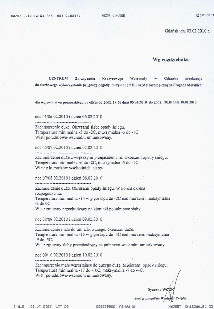 Biuro Meteorologicznych Prognoz Morskich Gdyni przekazało kolejną prognozę dla województwa pomorskiego na okres od 5 lutego godz. 19.30 do 10 lutego 2010.