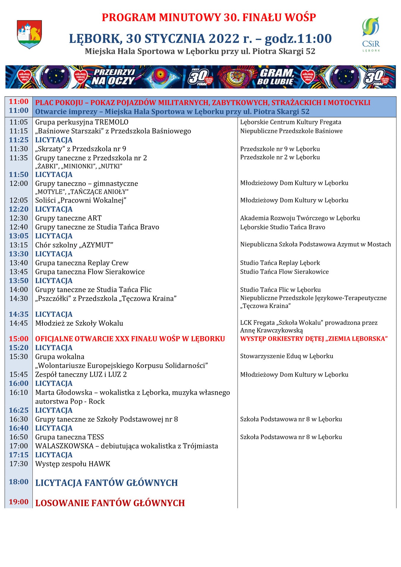 Lęborski Finał odbędzie się w dniu 30.01.2022 r. w Miejskiej Hali Sportowej przy ul. P. Skargi 52. Gramy od godz. 11:00. Podczas imprezy wystąpią dzieci i młodzież z lęborskich przedszkoli, szkół oraz placówek kulturalnych. Wystąpią również lokalne wokalistki i zespoły.