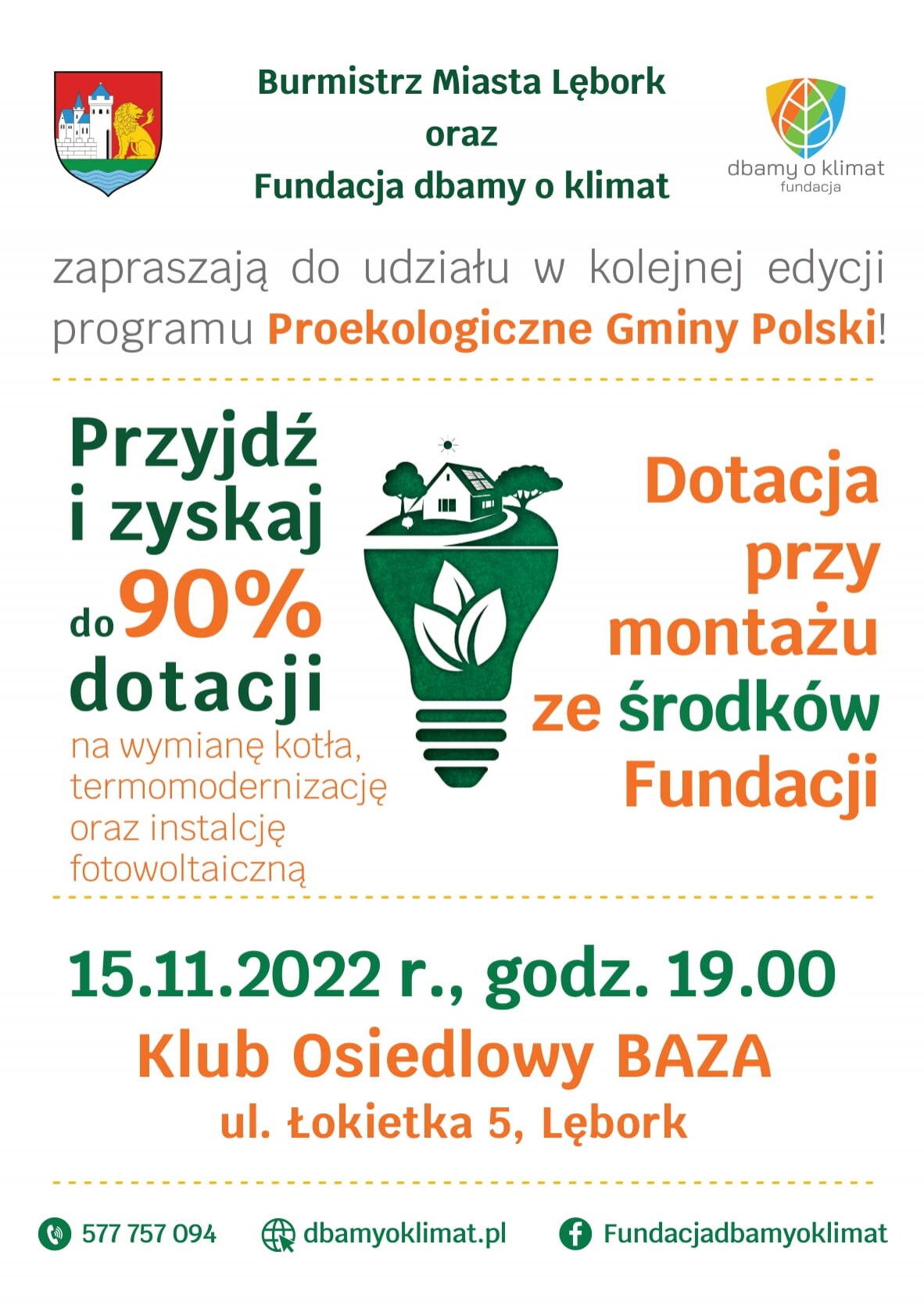 Miasto Lębork oraz Fundacja dbamy o klimat zapraszają do udziału w kolejnej edycji programu „Proekologiczne Gminy Polski!". Projekt został stworzony przez Fundację DBAMY O KLIMAT i realizowany jest cyklicznie na terenie zaproszonych samorządów. Projekt generuje efekt ekologiczny w zakresie obniżenia emisji do atmosfery szkodliwych substancji zanieczyszczających środowisko, w ujęciu zarówno lokalnym jak i globalnym. Generuje tym samym wiele korzyści dla miast, gmin i ich mieszkańców.
