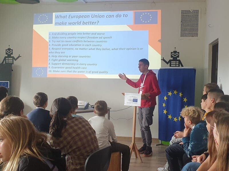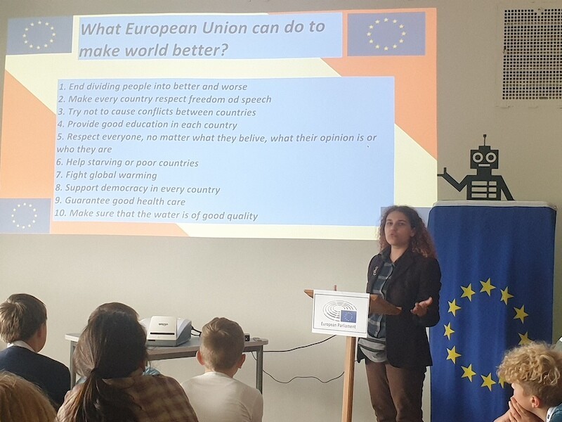 W pierwszym dniu gości z zagranicy w szkole, w nowej sali STREAM Lab powitała dyrektor placówki Grażyna Ruszkowska. Była muzyka, śpiew, drobne upominki, zajęcia sportowe, tańce i polskie pierogi. Goście uczestniczyli też w zajęciach lekcyjnych. W ramach zadań projektowych młodzież połączyła się online z posłem na sejm RP Jarosławem Wałęsą by porozmawiać z nim o przyszłości i najważniejszych celach Unii Europejskiej.
