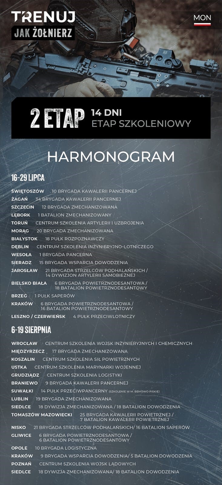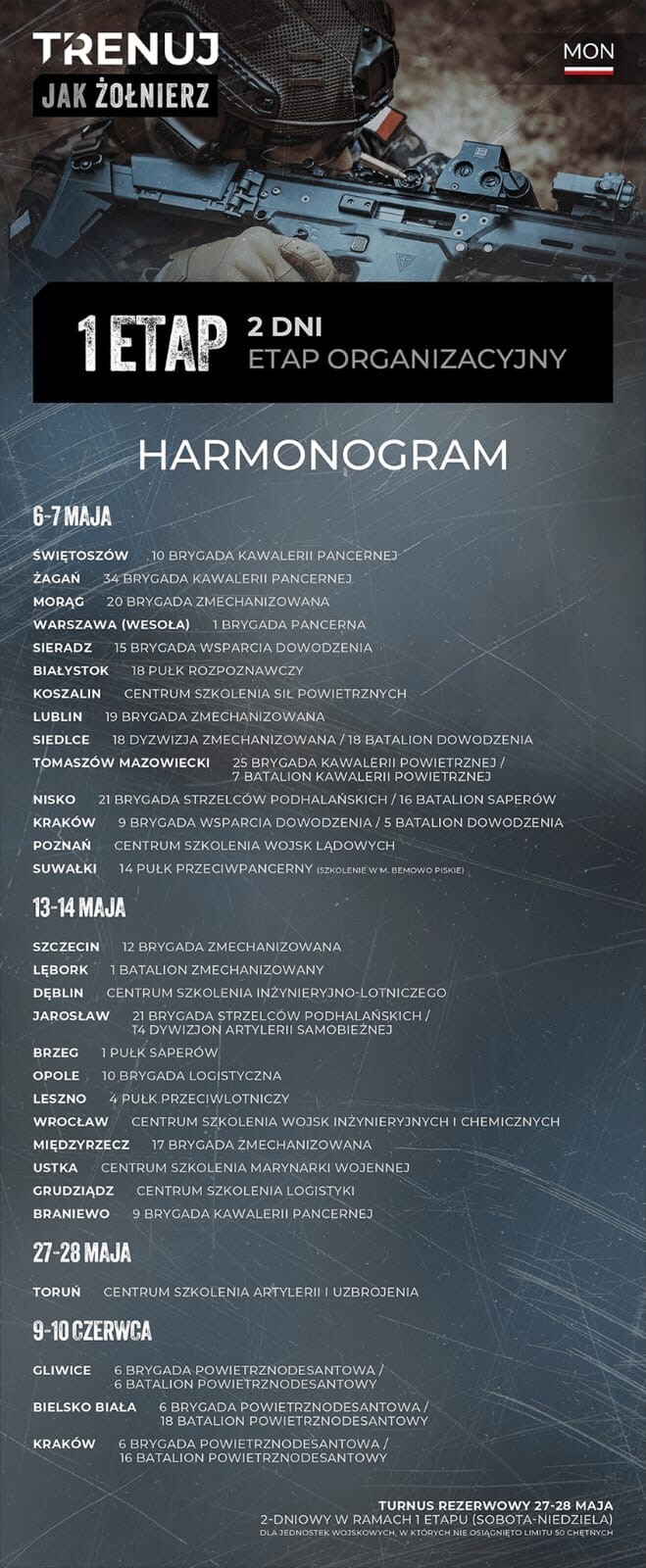 Pierwszy etap odbędzie się w weekend 13-14 maja w 1. Lęborskim Batalionie Zmechanizowanym oraz Centrum Szkolenia Marynarki Wojennej w Ustce. Szkolenie właściwe będzie prowadzone między 16 a 29 lipca w 1 BZ w Lęborku i w dniach 6-18 sierpnia w CSMW w Ustce. Zapisy na szkolenie odbywają się za pośrednictwem strony internetowej www.trenujjakzolnierz.wp.mil.pl lub bezpośrednio w jednostce wojskowej”.