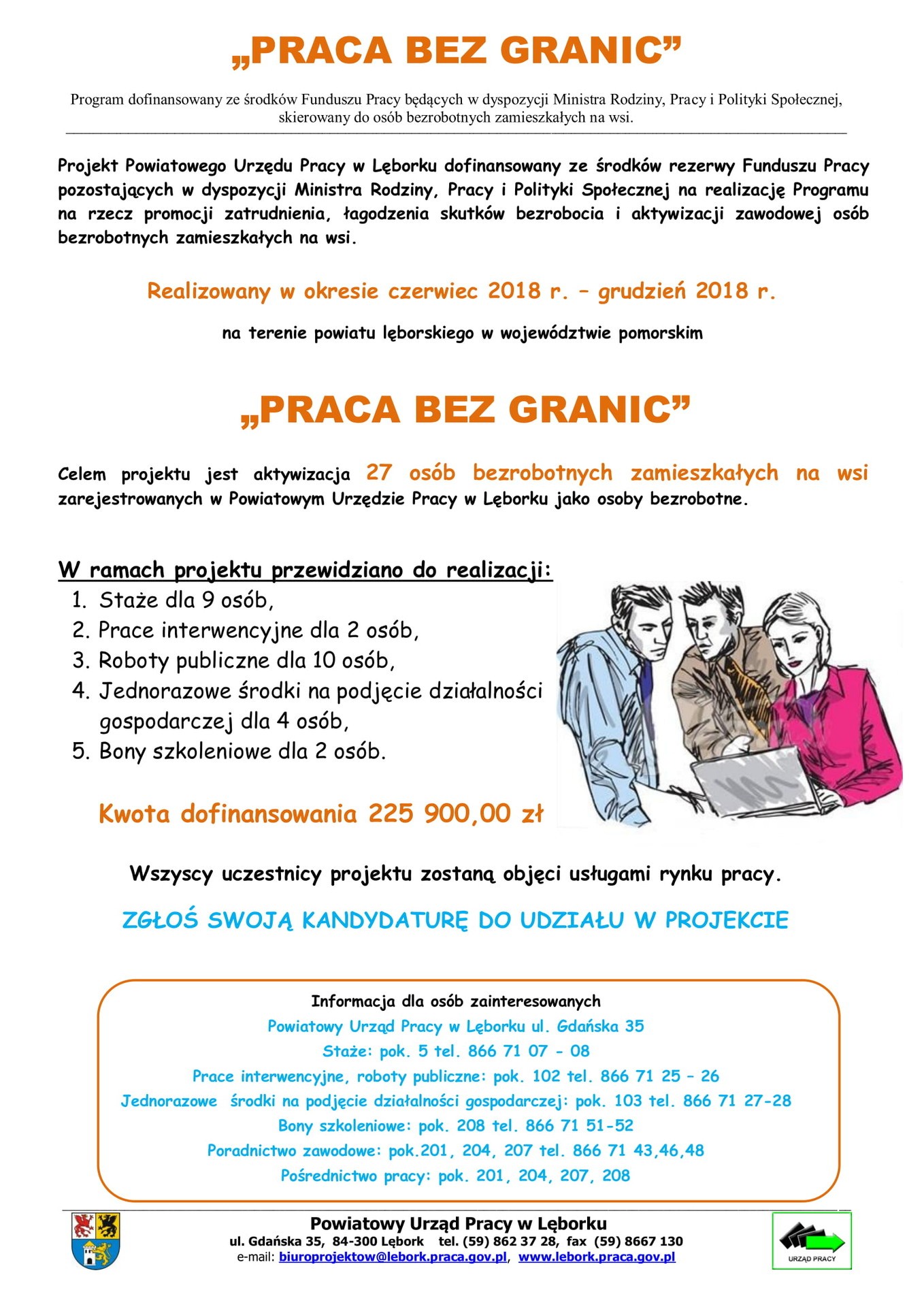 Powiatowy Urząd Pracy w Lęborku informuje, iż pozyskał dodatkowe środki Funduszu Pracy pozostające w dyspozycji Ministra Rodziny, Pracy i Polityki Społecznej na realizację programu skierowanego do osób bezrobotnych zamieszkałych na wsi – projekt pn. „Praca bez granic”.