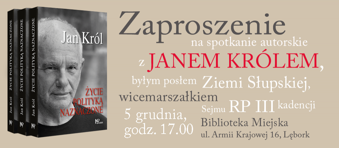 Miejska Biblioteka Publiczna w Lęborku zaprasza w dniu 5 grudnia 2022 roku o godz. 17.00 na promocję najnowszej książki Jana Króla pt. "Życie polityką naznaczone", które odbędzie się w klubie Biblioteki Miejskiej w Lęborku (wejście od ul. M. Konopnickiej) . Wstęp wolny.