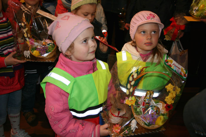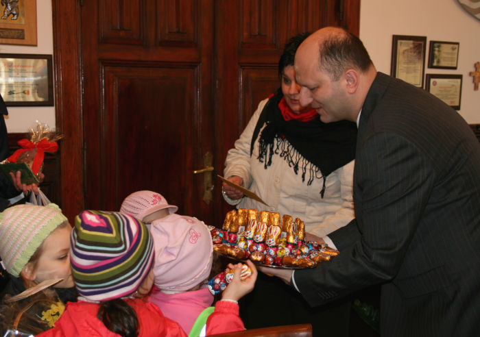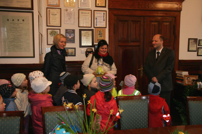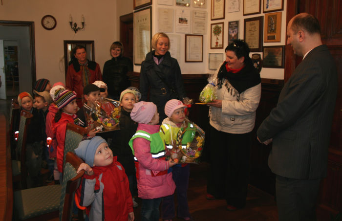 Przedszkolaki obdarowały Burmistrza pięknie przystrojonym w wiosenne akcenty wielkanocnym koszyczkiem, natomiast Włodzimierz Klata odwdzięczył się czekoladowymi zajączkami. Burmistrz życzył małym lęborczanom i ich rodzinom zdrowia i radości oraz spokojnych Świąt Wielkanocnych. Spotkanie umiliły łakocie oraz zwiedzanie Sali Rajców w budynku Ratusza.