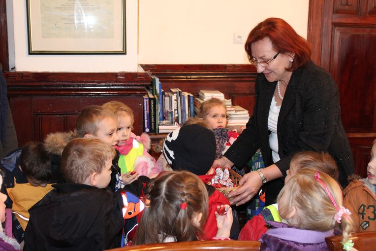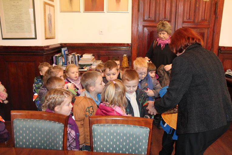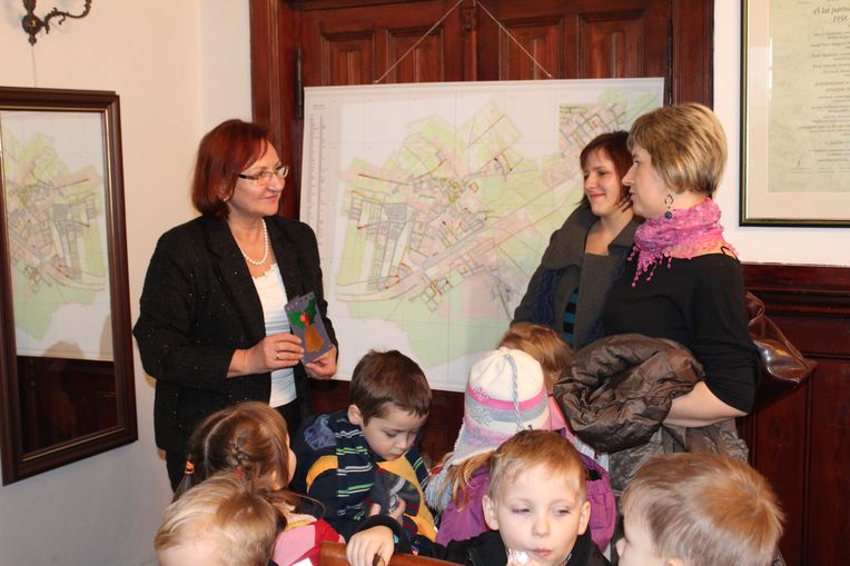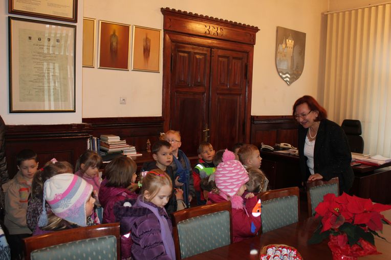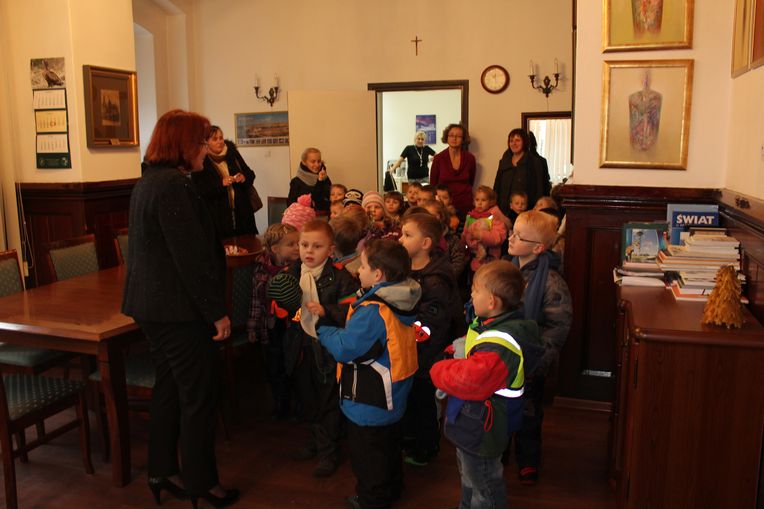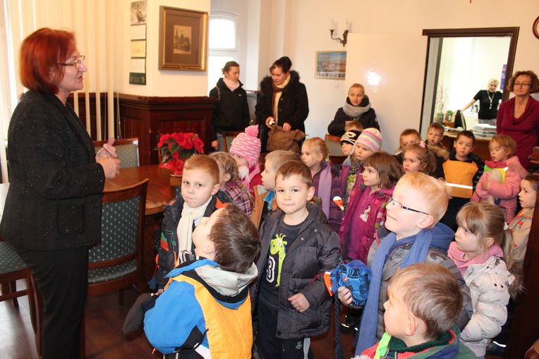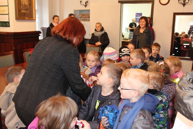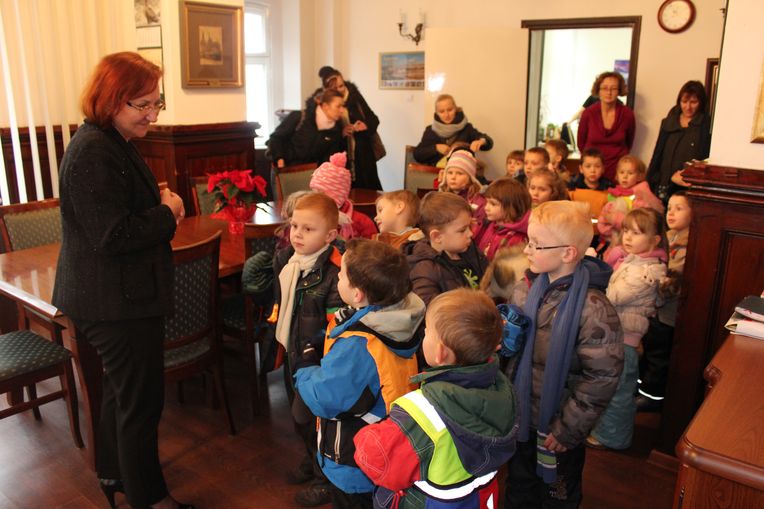 Przedszkolaki spotkały się z zastępcą burmistrza Alicją Zajączkowską. Złożyły życzenia dla wszystkich pracowników ratusza i mieszkańców miasta oraz zaśpiewały kolędę. Każde dziecko otrzymało w podziękowaniu słodki upominek. Dzieci obejrzały też salę rajców oraz niedawno wyremontowany skarbiec.