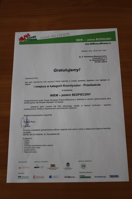 Przedszkole nr 5 zwycięzcą konkursu Na Wszelki Wypadek VIII " Wiem jestem bezpieczny"