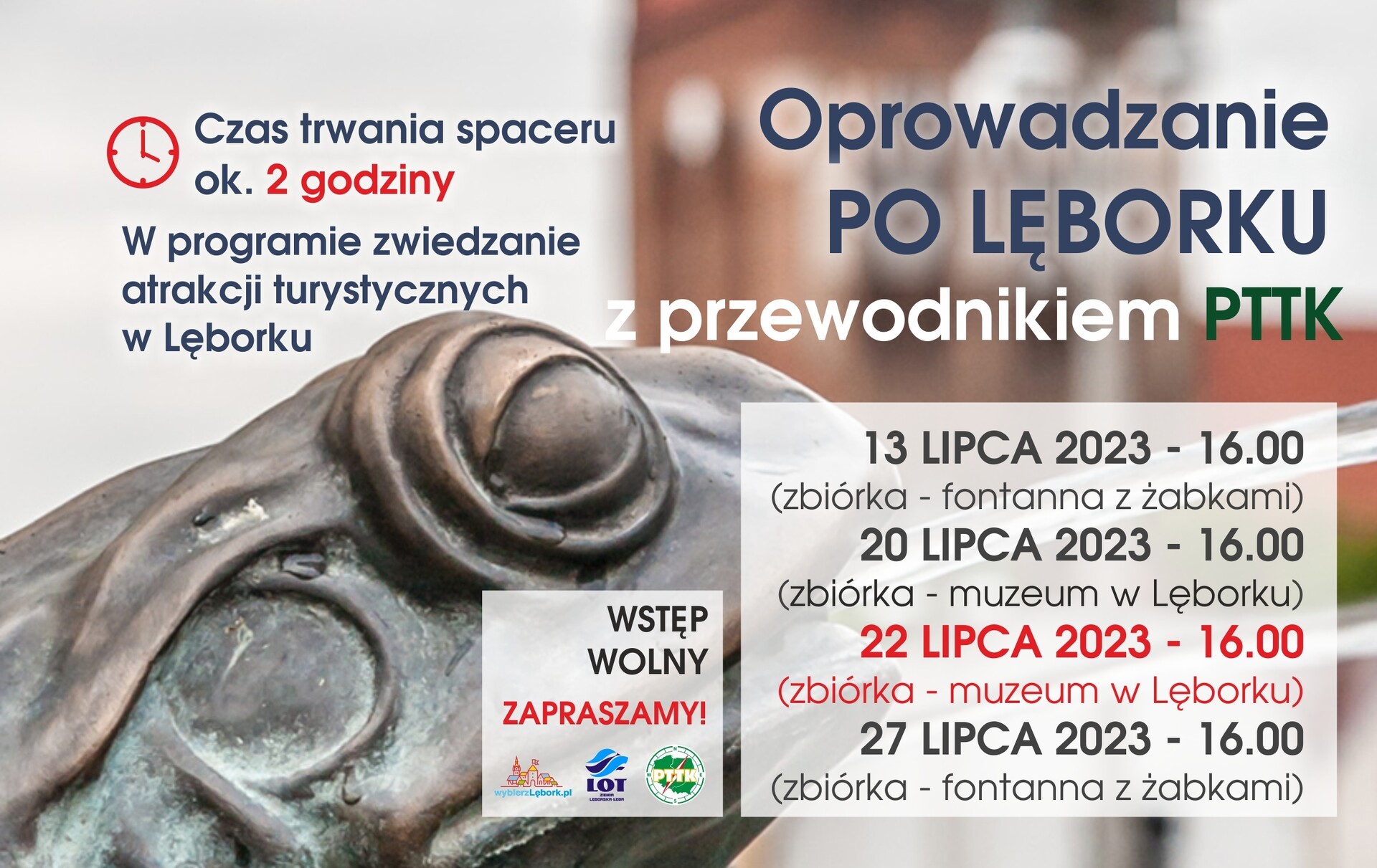 Zbiórki uczestników około 2-godzinnych spacerów z historią w tle przy fontannie żabkami o godzinie 16.00, za wyjątkiem czwartku 20 lipca i dodatkowo soboty 22 lipca, kiedy zbiórka przeniesiona będzie pod budynek Muzeum przy ul. Młynarskiej. Lęborscy przewodnicy serdecznie zapraszają mieszkańców i turystów. Udział w wycieczkach jest dla uczestników bezpłatny. Szczegóły na plakacie: