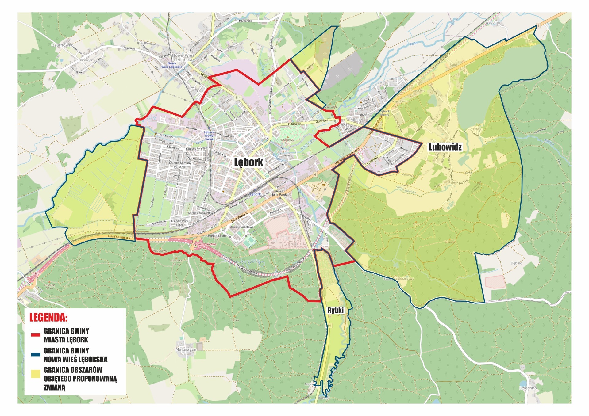 Z wnioskiem o zmianę granic administracyjnych Miasta Lęborka wystąpiła grupa mieszkańców i właścicieli nieruchomości z przyległych terenów gminy Nowa Wieś Lęborska, oczekując włączenia ich nieruchomości w granice Miasta. Zgodnie z art. 4b ust 1 ustawy o samorządzie gminnym zmiany granic administracyjnych gmin dokonuje Rada Ministrów, na wniosek zainteresowanej gminy. Zaproponowany w projekcie uchwały obszar został wyznaczony w oparciu o wniosek mieszkańców Lubowidza i Rybek oraz właścicieli innych terenów w sposób zapewniający gminie terytorium możliwie jednorodne ze względu na układ osadniczy i przestrzenny, uwzględniający więzi społeczne, gospodarcze i kulturowe oraz zapewniający zdolność wykonywania zadań publicznych. Obszar ten został zaznaczony na mapie stanowiącej integralną część uchwały.