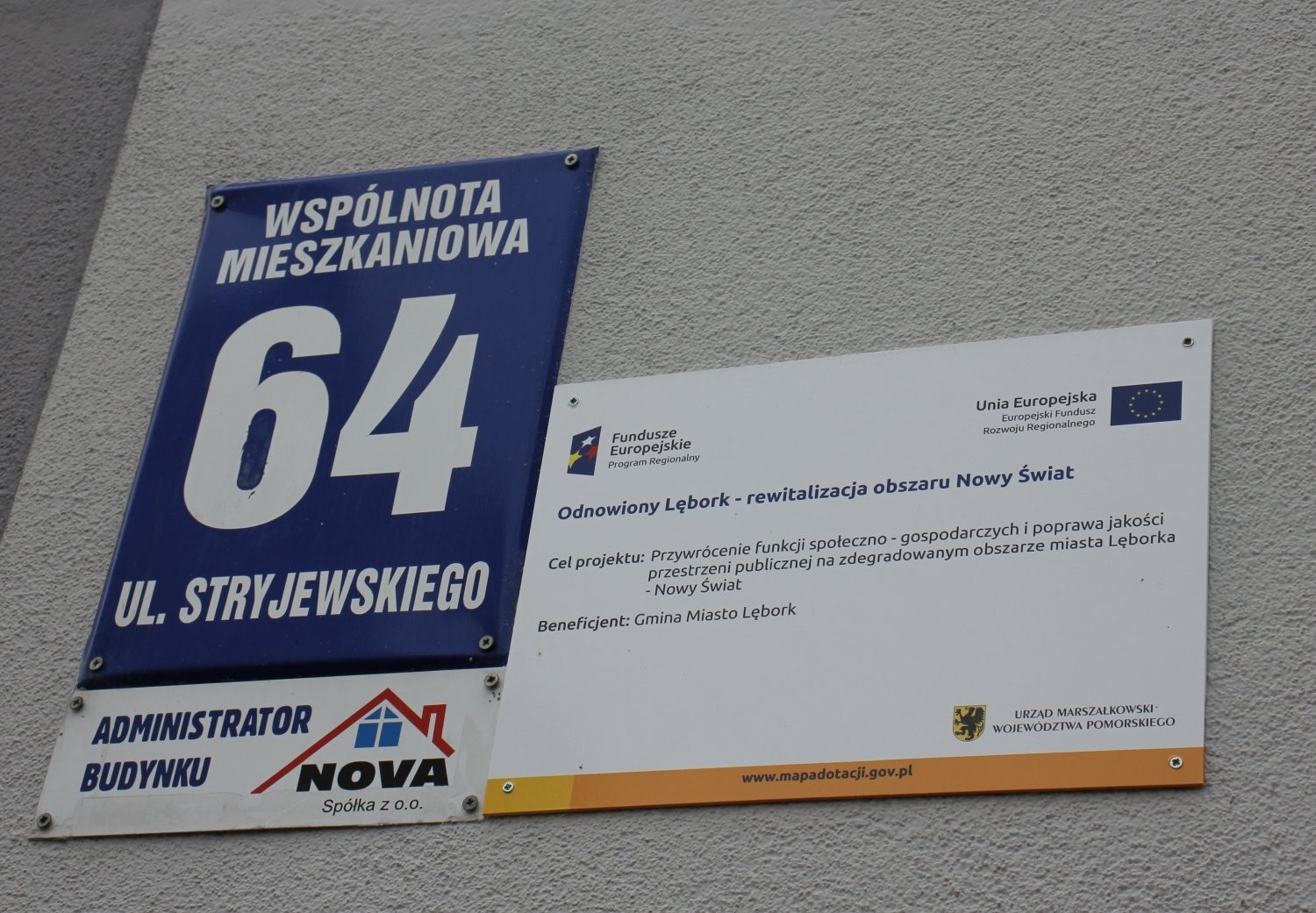 Jednym z najbardziej widocznych efektów działań Miasta Lęborka w ramach programu rewitalizacji na obszarze „Lębork Nowy Świat” są odnowione budynki komunalne. Spektakularny efekt uzyskano w kamienicy z drugiej połowy XIX wieku przy ulicy Łokietka 1. Pracownia „Szpilewicz Architekci” wyszła z ideą odtworzenia elewacji budynku zgodnie z zachowanymi przedwojennymi zdjęciami. Na elewację powróciło poziome boniowanie w partii cokołowej oraz na pierwszej kondygnacji. Poziomą kompozycję elewacji podkreślają gzymsy między kondygnacyjne oraz podokienne. Osie elewacji podkreślone są obramieniami okiennymi oraz trójkątnymi i łukowymi tympanonami nadokiennymi. Pola poniżej parapetów okien podkreślono kasetonami podokiennymi. Prace budowlane wykonało Przedsiębiorstwo Budownictwa Ogólnego ROM-BUD Roman Pieper z Lęborka. W ramach tego samego, wartego ponad 384 tys. zł zlecenia wyremontowany został także budynek komunalny przy Kossaka 87 oraz w mniejszym zakresie budynek Gdańska 11.
