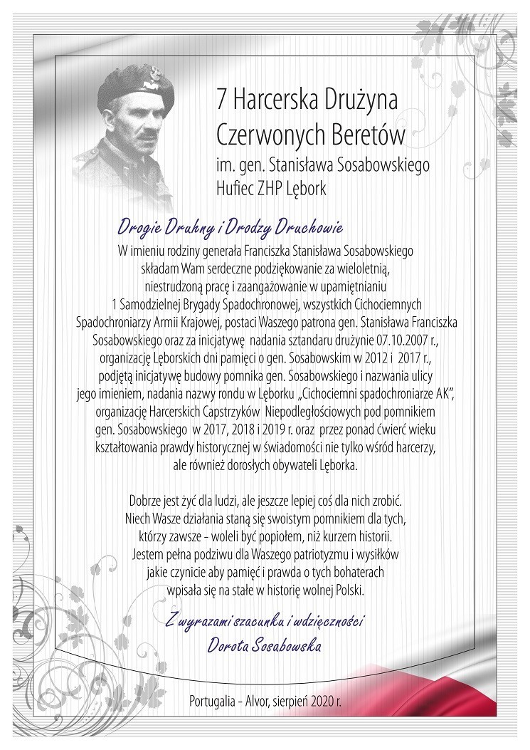 W liście Dorota Sosabowska w imieniu rodziny generała Franciszka Stanisława Sosabowskiego przesłała lęborskiej drużynie piękne i wzruszające podziękowanie za wieloletnią, niestrudzoną pracę i zaangażowanie w upamiętnianiu 1 Samodzielnej Brygady Spadochronowej, Cichociemnych-Spadochroniarzy AK i naszego patrona generała Stanisława Sosabowskiego. Za ich inicjatywy, jak nadanie sztandaru drużynie, budowę pomnika czy nadanie nazwy ulicy, a teraz też ronda.