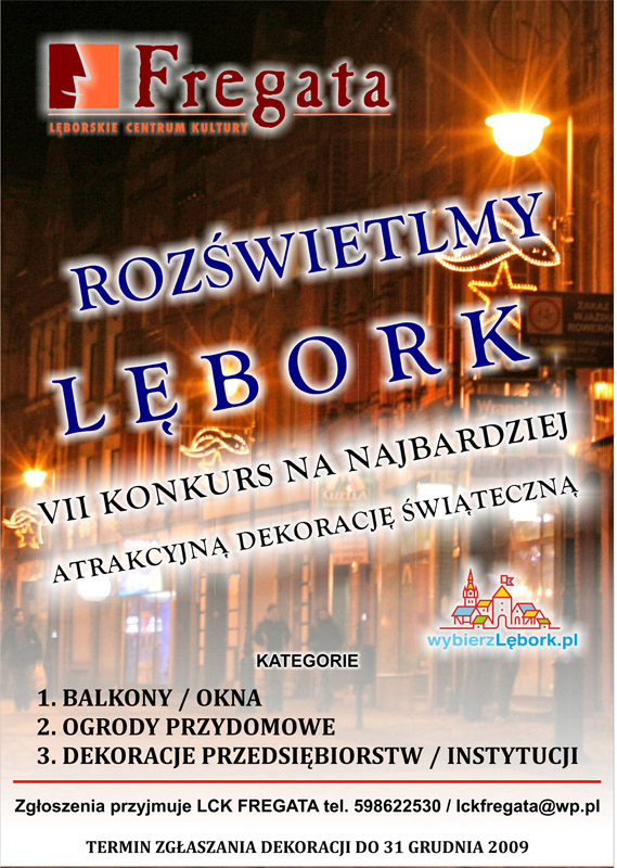 - Konkurs trwa od 15 grudnia 2009r. do 9 stycznia 2010r. - informuje Paweł Piwka, dyrektor LCK „Fregata", główny główny organizator konkursu. - Zachęcam lęborczan do zgłaszania do końca grudnia wyróżniających się pomysłowością i urodą dekoracji świątecznych. Spośród zgłoszonych ofert komisja konkursowa na początku stycznia wyłoni zwycięskie obiekty w poszczególnych kategoriach.
