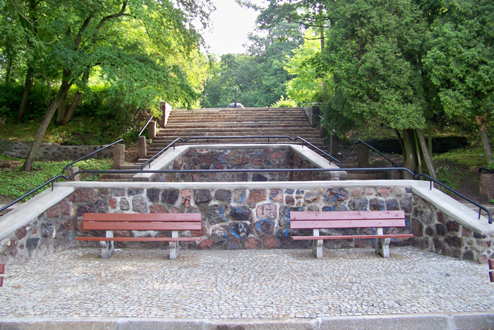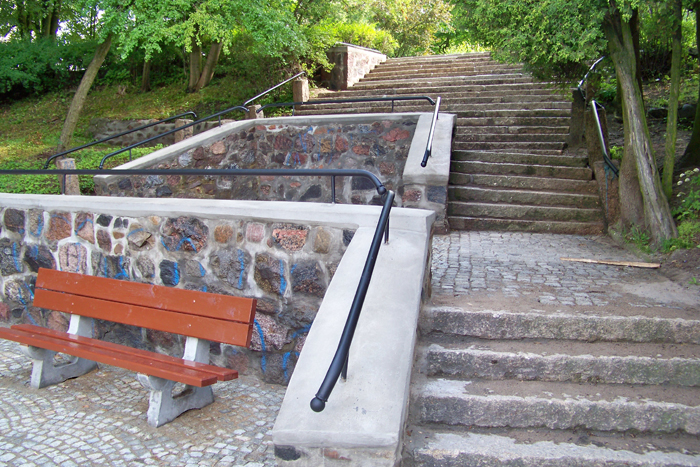 Wykonane też zostały roboty kamieniarskie - uzupełniono brakujące kamienie, tynk, położono „czapki" na murkach - prace te wykonała firma „Anarex" Zbigniew Pozorek, natomiast poręcze i barierki zrealizował Usługowy Zakład Ślusarsko-Instalacyjny Janusza Chroła z Lęborka. Całości dopełniły dwie nowe ławki parkowe, które stanęły pod schodami.