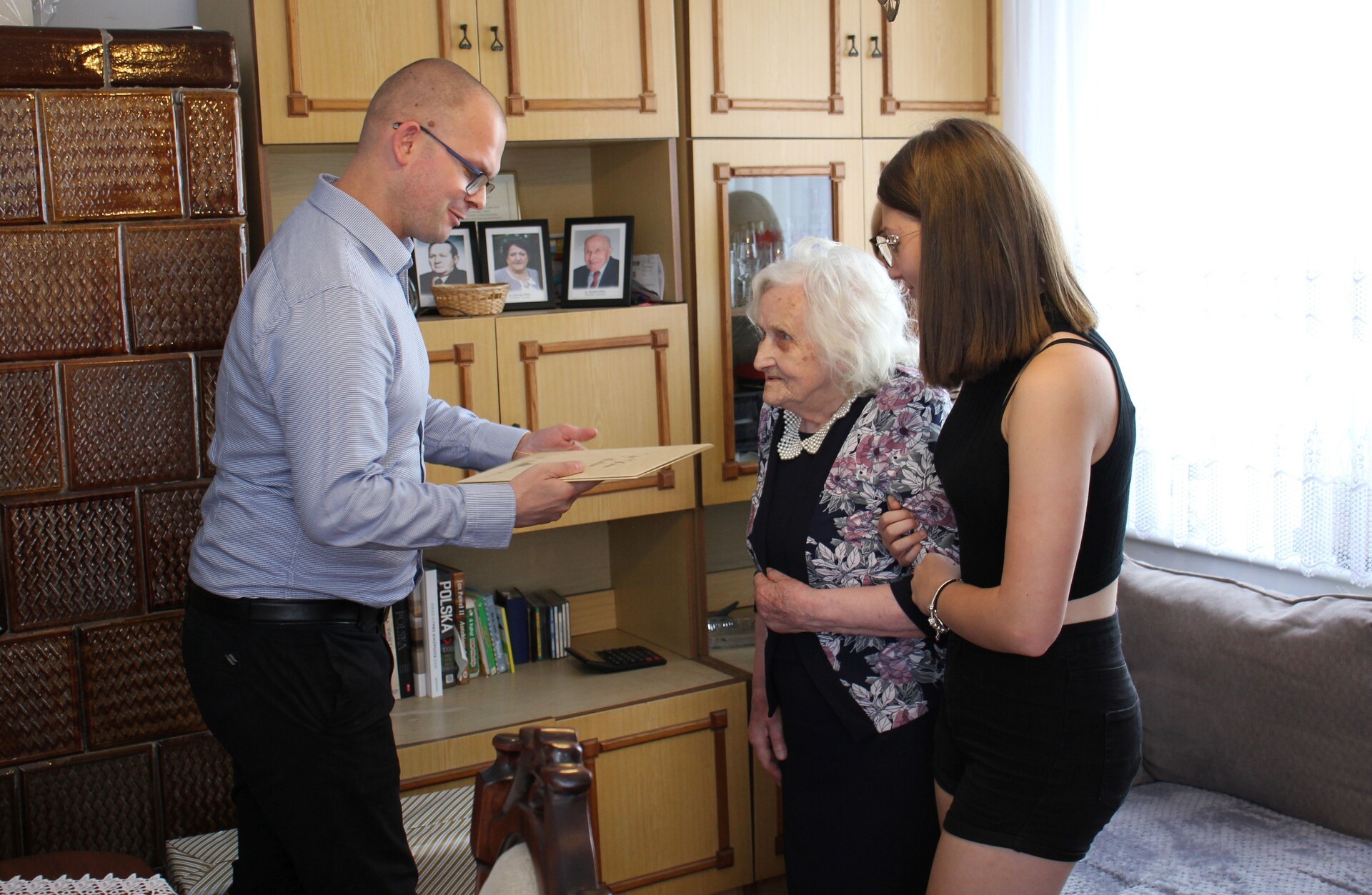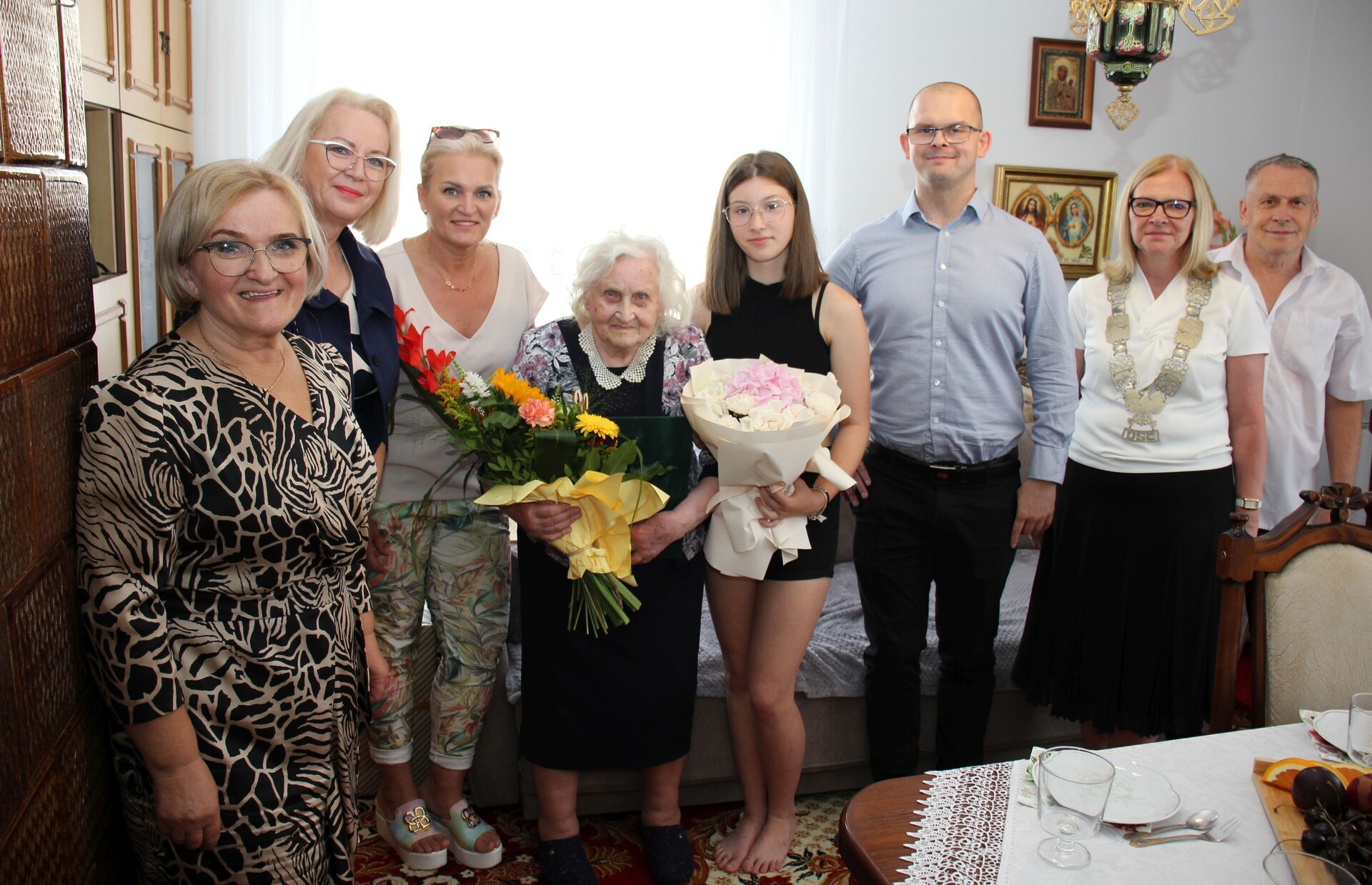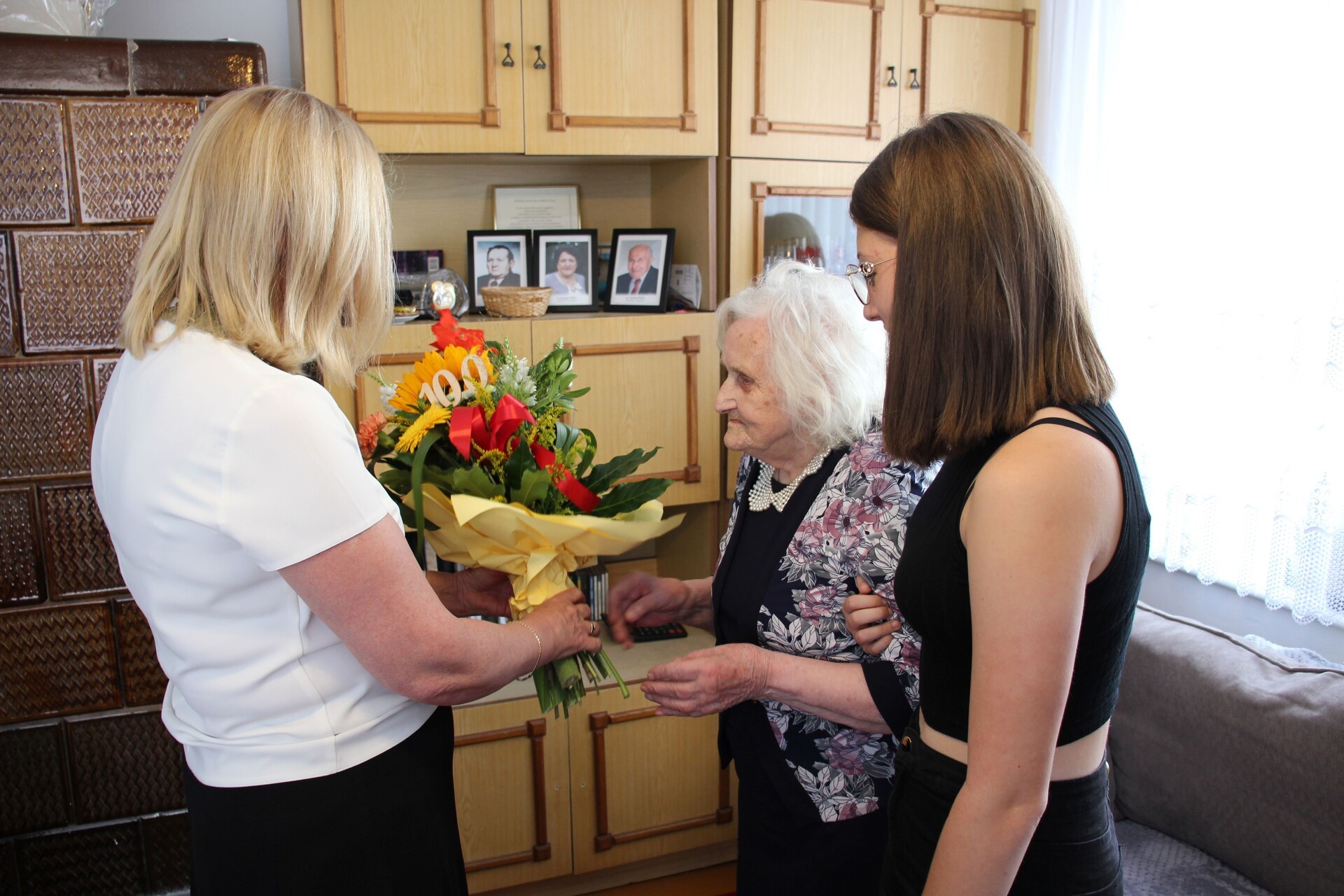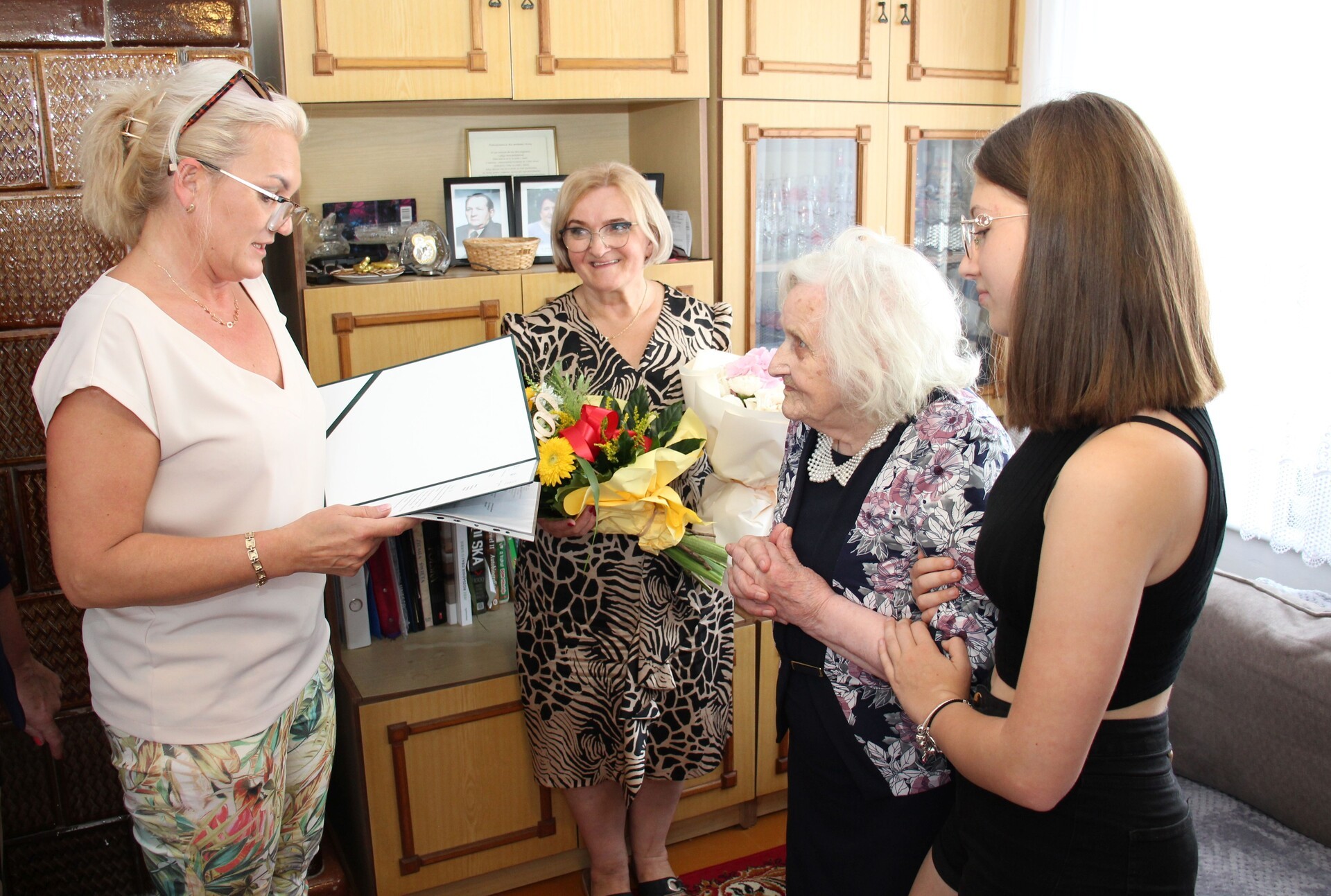 Piękny jubileusz był okazją do rodzinnego świętowania, a także do wizyty u Jubilatki burmistrza Lęborka Jarosława Litwina, kierownik Urzędu Stanu Cywilnego Mirosławy Gaffke, kierownika lęborskiego Inspektoratu Zakładu Ubezpieczeń Społecznych Haliny Orlikowskiej i zastępcy naczelnika wydziału świadczeń ZUS Joanny Kochman.