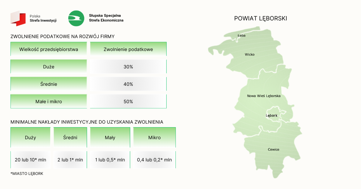 Aby uzyskać zwolnienie podatkowe, przedsiębiorcy muszą spełnić minimalne nakłady inwestycyjne, które są różne w zależności od wielkości firmy (powiat lęborski):