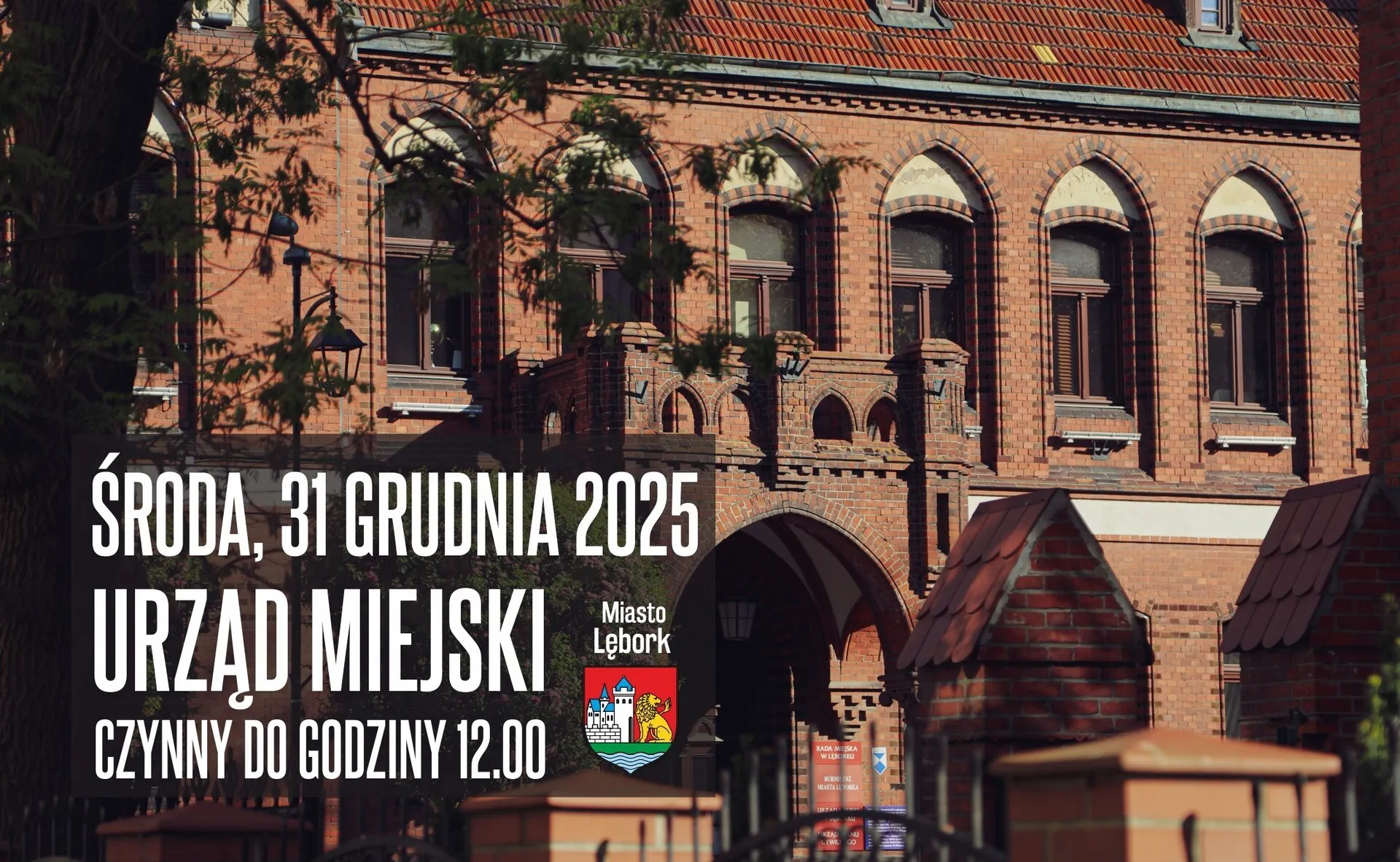 Informujemy, że w środę, 31 grudnia 2025 r., Urząd Miejski w Lęborku będzie czynny do godziny 12:00. Prosimy o uwzględnienie tej zmiany przy planowaniu wizyty w urzędzie. Za ewentualne niedogodności przepraszamy.